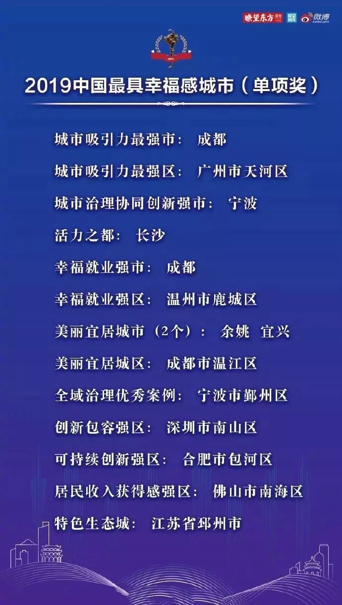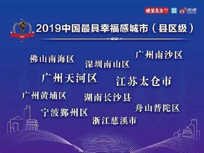 广州市入选“2019中国最具幸福感城市”,广州市天河区、广州市黄埔区、广州市南沙区、深圳市南山区、佛山市南海区荣获“2019中国最具幸福感城市(县/区)”称号。