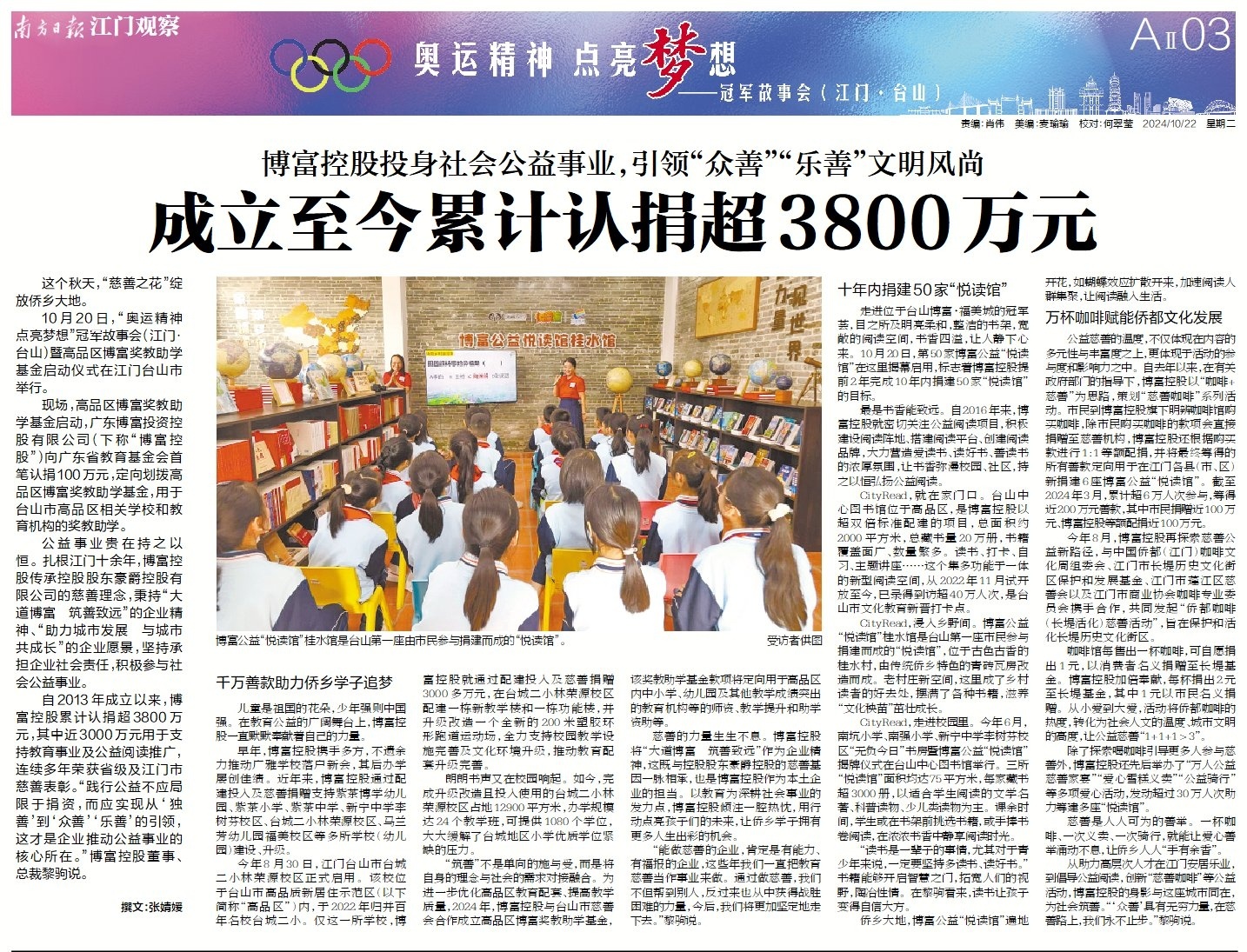 扎根江门十余年,博富控股传承控股股东豪爵控股有限公司的慈善理念,秉持“大道博富 筑善致远”的企业精神、“助力城市发展 与城市共成长”的企业愿景,坚持承担企业社会责任,积极参与社会公益事业。