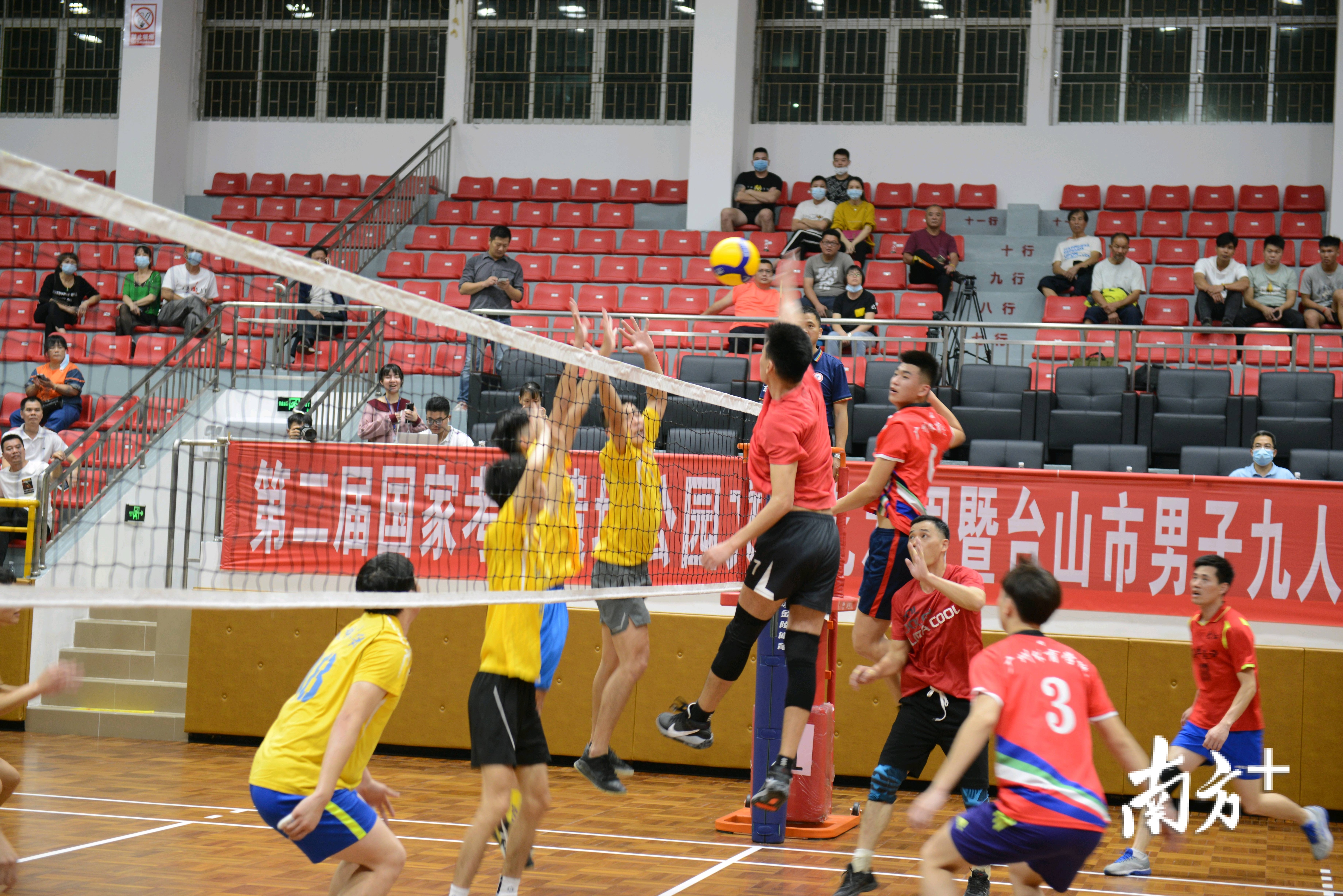 当晚8时,在台山体育馆,台山大江镇与端芬镇排球队举行了一场男子九人排球精英赛,双方队员在球场上奋勇拼博。为做好疫情防控工作,本次排球赛采用云上排球赛形式,现场不设观众席,采用APP直播让观众“云上观看”赛事。