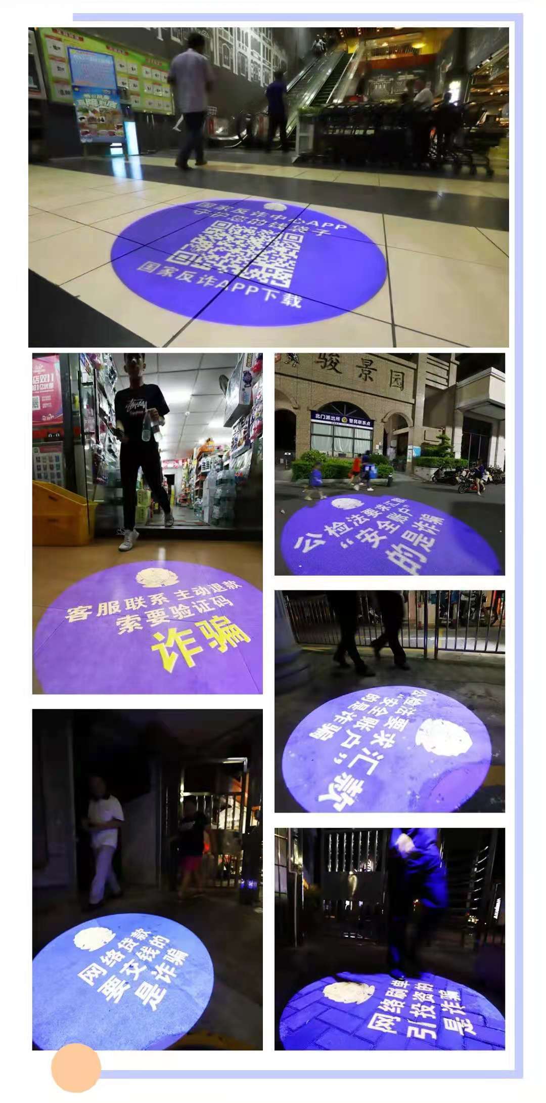 每个镭射灯均安装在小区、商圈、生活超市最醒目位置,内容主要针对近期高发电信网络诈骗类型做出的防范提醒,进一步营造反诈宣传家喻户晓、全民参与的浓厚氛围。