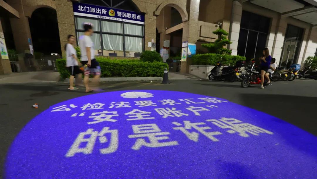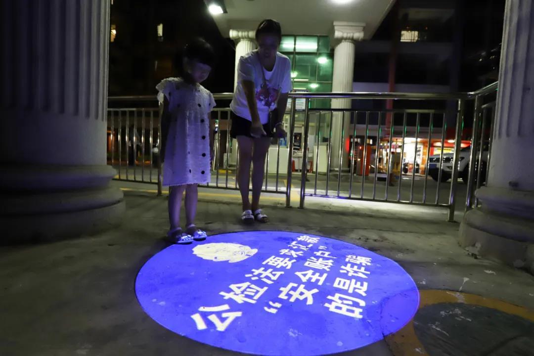 晚上七点半,夜幕降临,小区进出口的反诈镭射灯准时亮起,“安装国家反诈中心APP守护您的钱袋子”“公检法要求转账‘安全账户’是诈骗”“网络贷款先交钱就是诈骗”等字样投射在地上,新颖炫酷的宣传方式,吸引居民驻足关注。