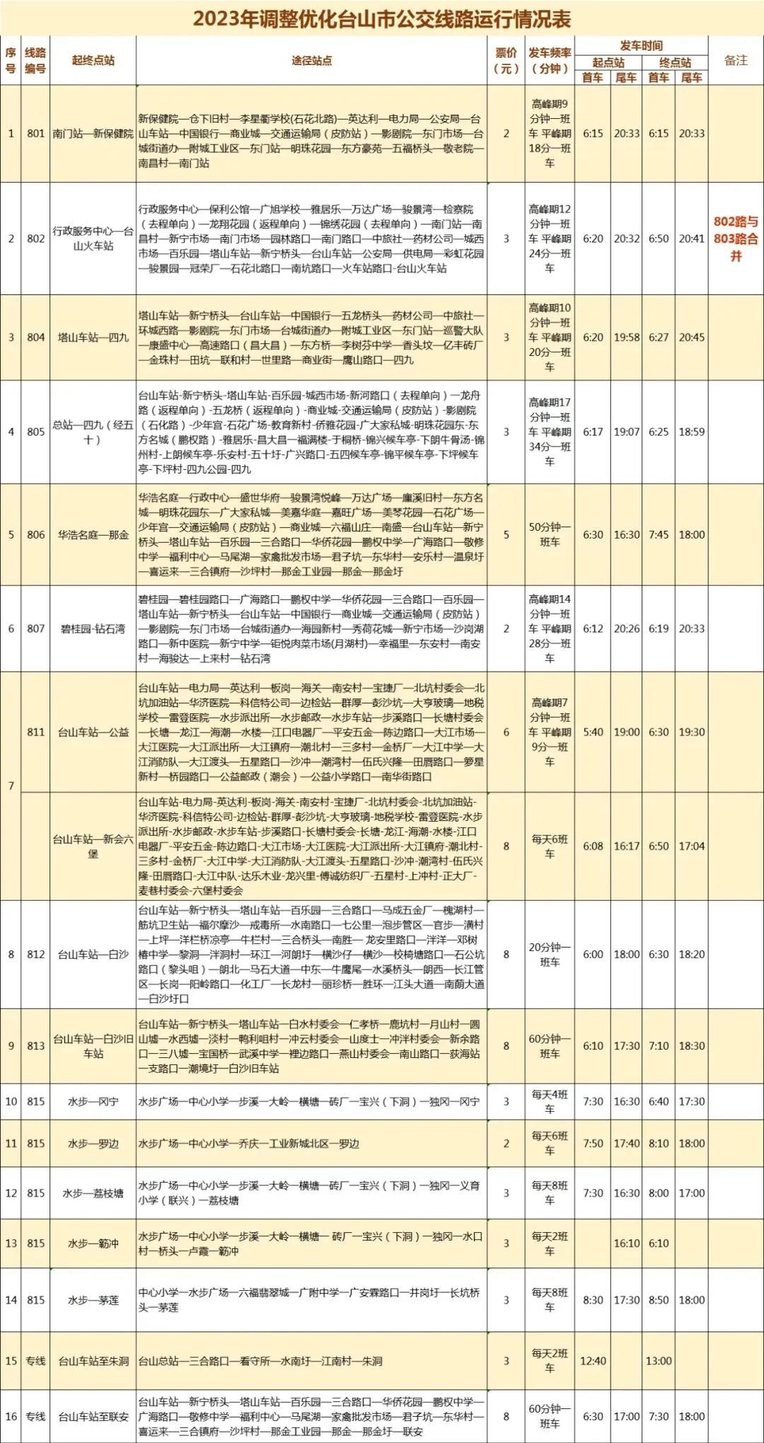 根据台山公交客源情况,为减少资源浪费,支持台山公交科学发展,台山公共汽车分公司近期对台山公交线路进行优化运营。具体运行情况如下表: