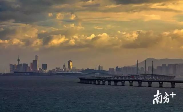 △傍晚时分,天空一片金黄,港珠澳大桥旁的澳门地标建筑熠熠生辉。
