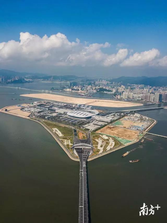 △珠澳口岸人工岛位于珠海拱北湾南侧的珠澳口岸人工岛,是港珠澳大桥主体工程与珠海、澳门两地的衔接中心,人工岛东西宽930至960米、南北长1930米,工程填海造地总面积近220万平方米。