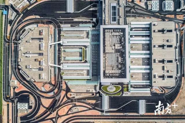 △港珠澳大桥珠海公路口岸占地面积约70.33万平方米,从空中俯瞰,整个口岸外形按照“如意”造型设计,寓意“一地三通,如意牵手”。