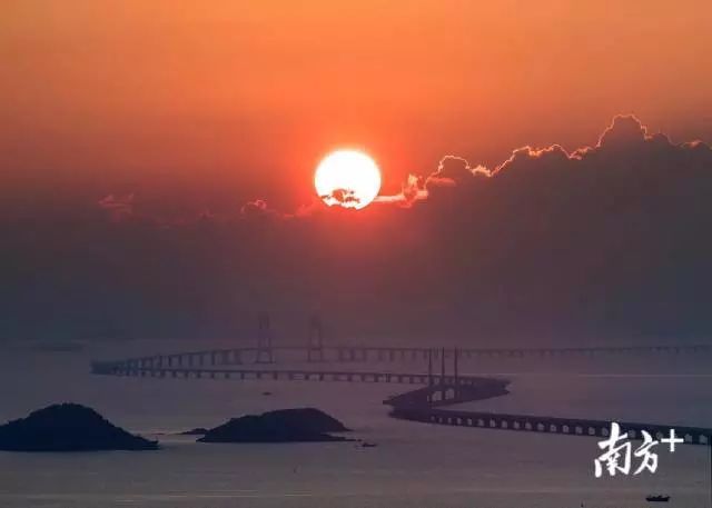 △2018年5月22日,太阳从香港大屿山后升起,港珠澳大桥犹如一条巨龙蜿蜒盘绕在海面上。