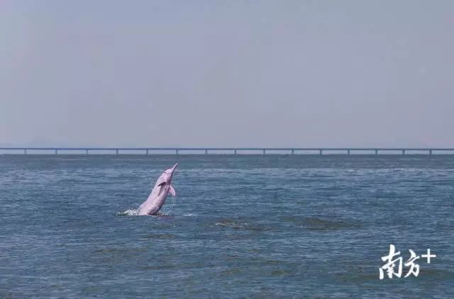 △2018年8月7日,一只成年中华白海豚突然跃出海面,背景不远处正是雄伟的港珠澳大桥。