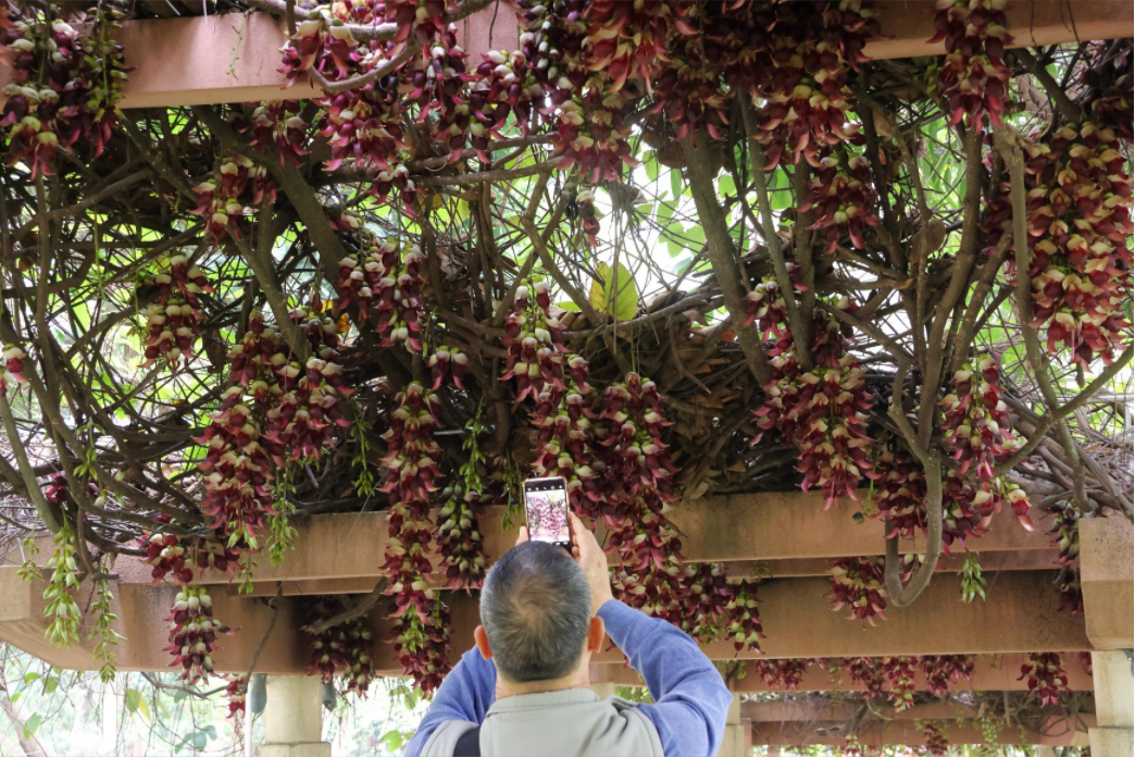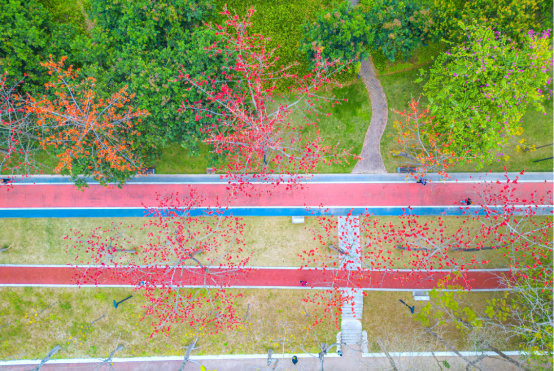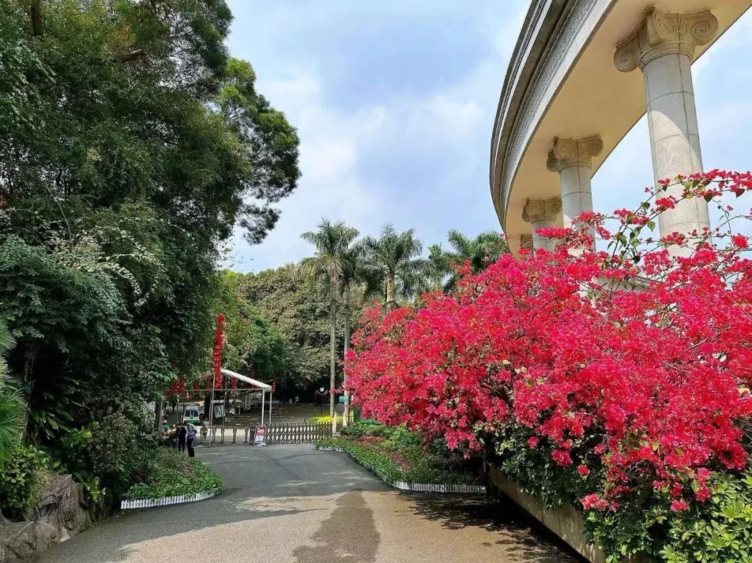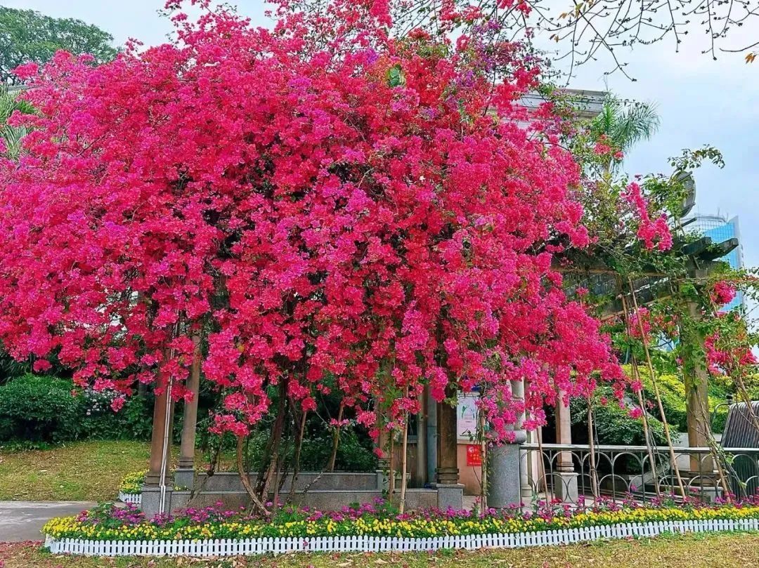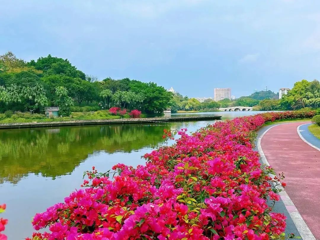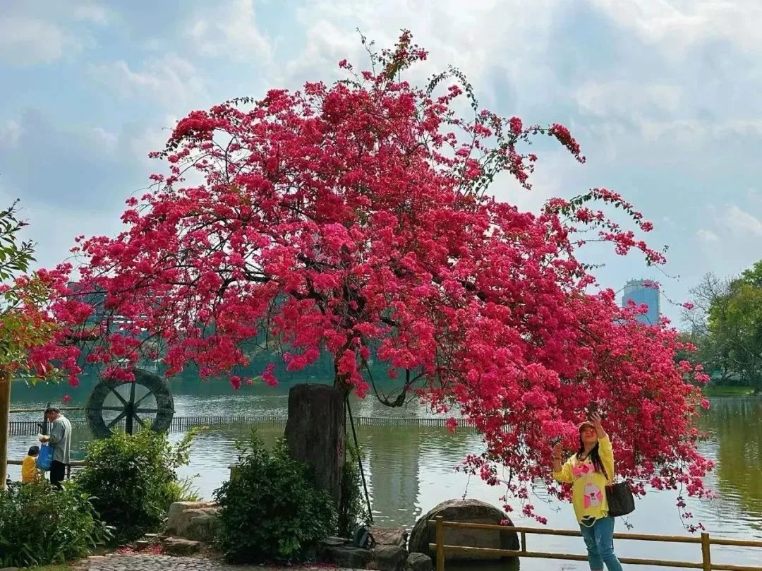 近日,这里一带成了花的海洋,簕杜鹃、木棉花、禾雀花迎来盛放期,吸引不少游人前来打卡。