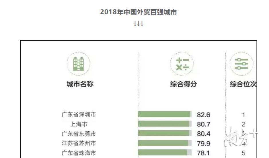 和前一年榜单相比,进入前10强的深圳、东莞、珠海、广州得分均创出了新高,而且和后面城市的差距在拉大,和排名在前的城市差距在缩小。如在“2018年中国外贸百强城市”榜单中,排第3位的东莞总分为80.4分,与排第2位的上海分差由0.6分缩小到0.3分。