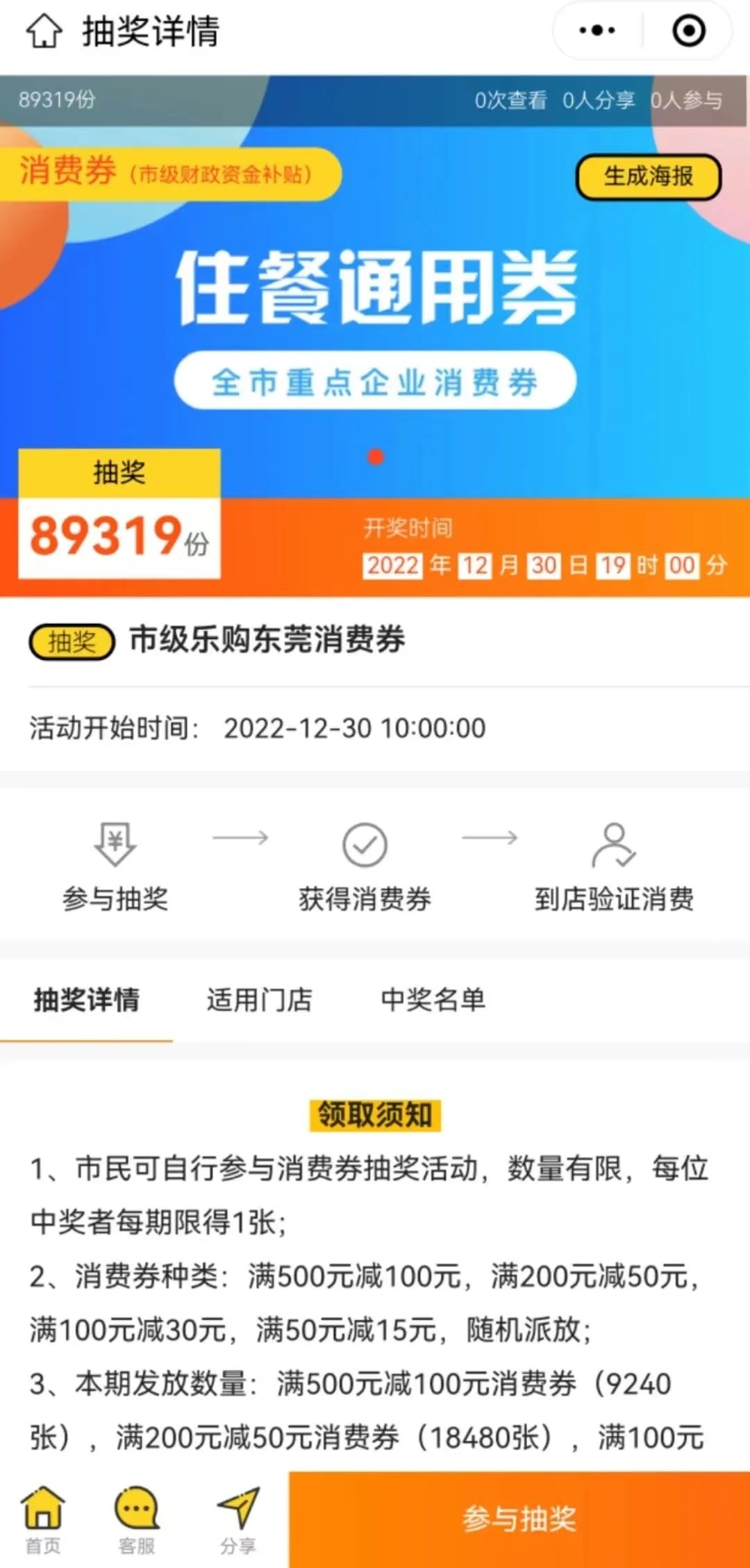 通用消费券主要通过“乐购东莞”微信小程序报名抽奖领取,通用消费券面值拟为“满1000减200元”“满500减100元”“满200减50元”“满100减30元”“满50减15元”,核销有效期为7个自然日。