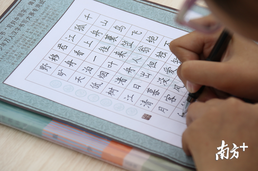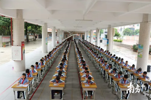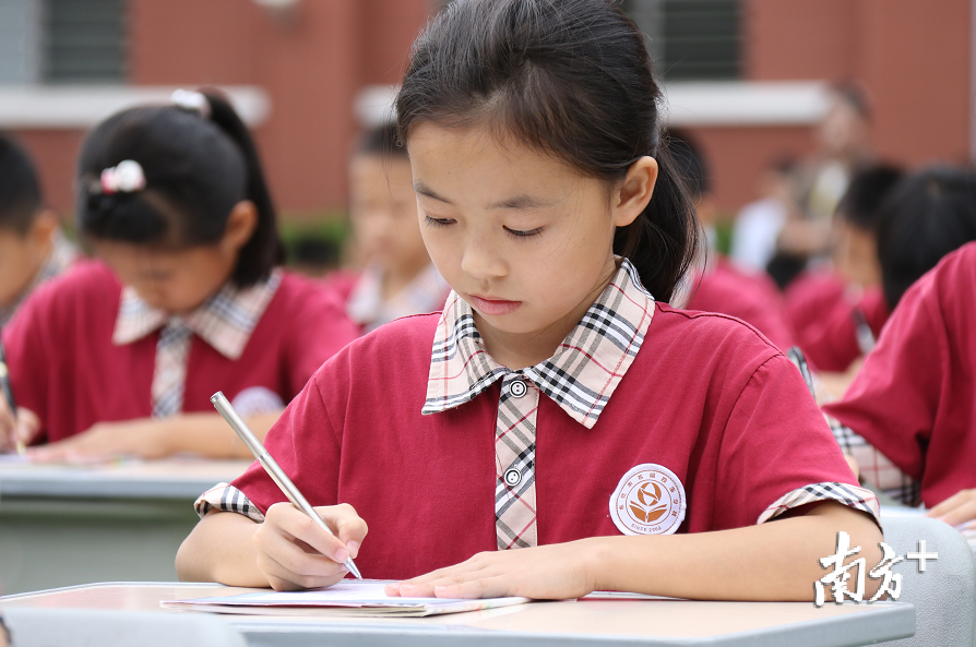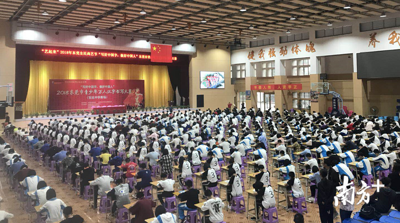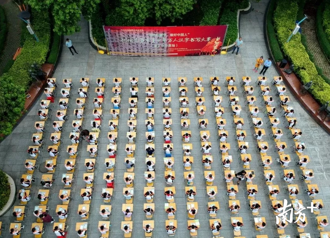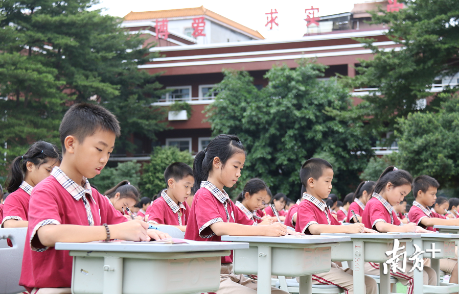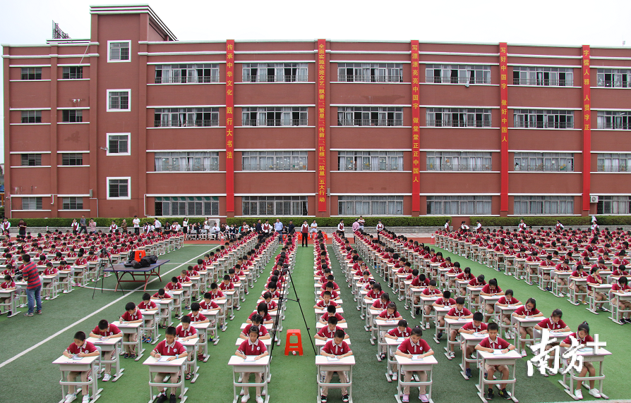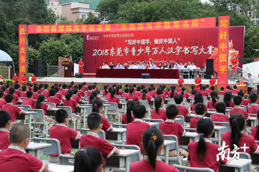 秋风拂面,午后的东莞天气舒爽。石碣镇四海学校的球场上,近千人齐聚于此,整整齐齐端坐在桌前,一个个俊秀的汉字随着笔尖移动跃然纸上。