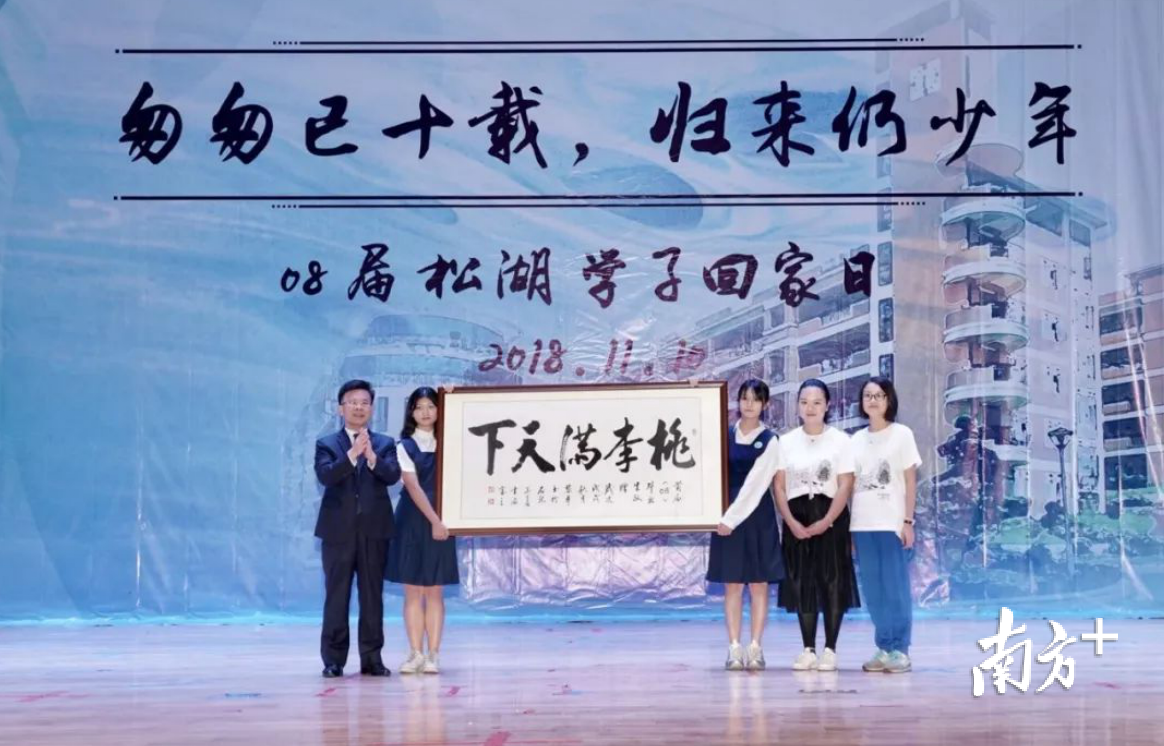 “洒扫庭除迎长子,寸草心仪三春晖,松湖莞中,我们永远的家”校友日大会现场,校长黎德文的一席话让在场校友感慨。一曲《光阴的故事》毕,校友代表向学校赠送牌匾《桃李满天下》作为纪念。