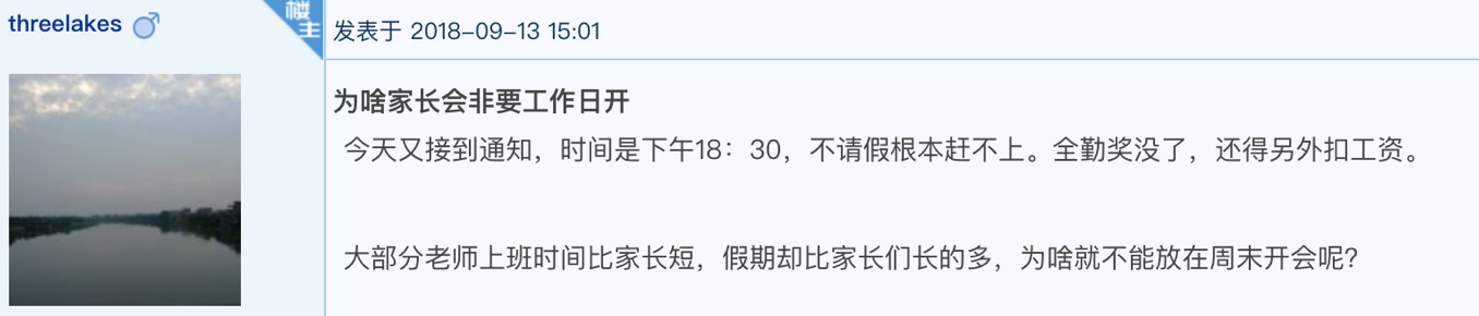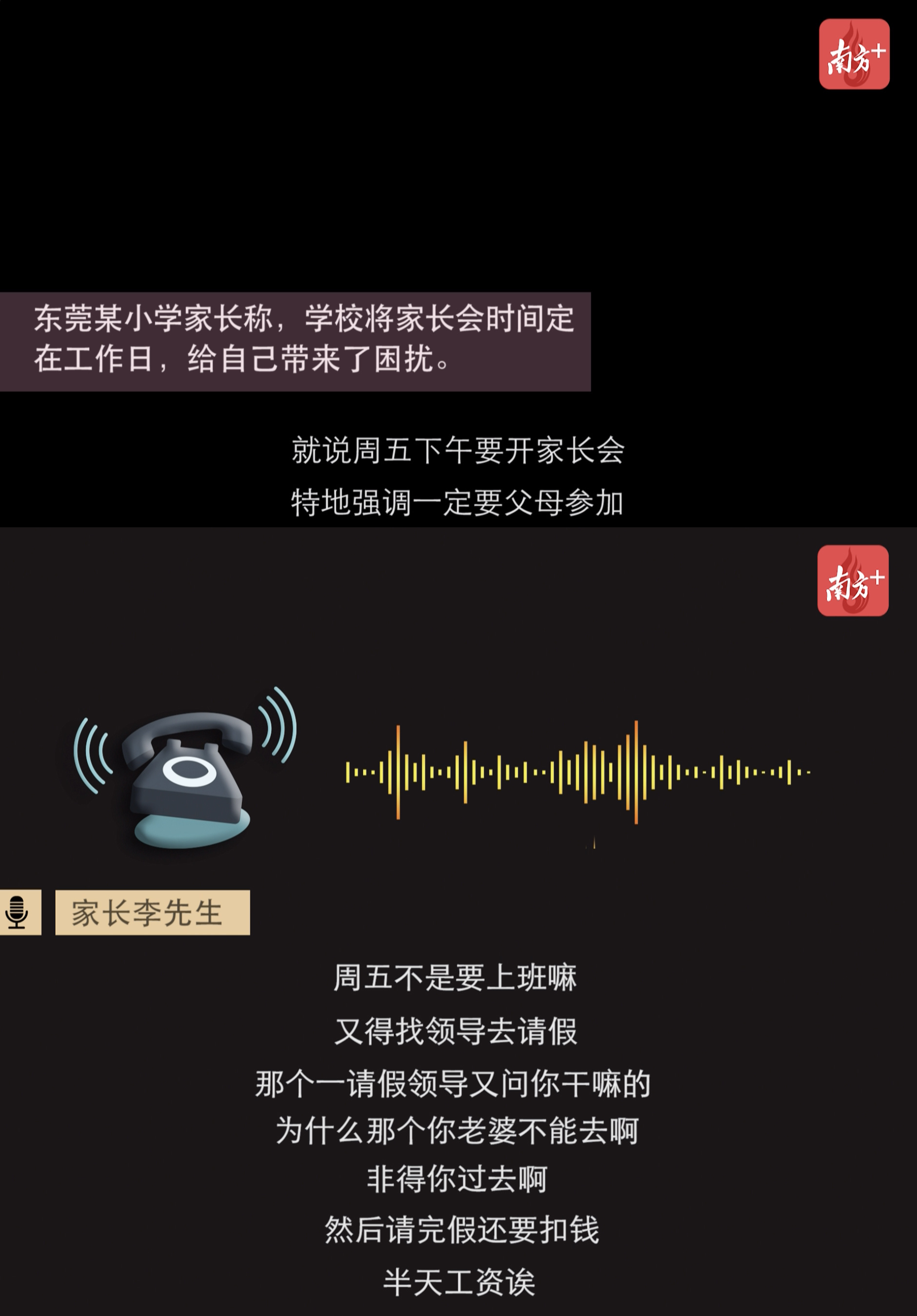 最近,东莞一位家长李先生就向小莞家诉苦,称学校将家长会的时间安排在周五的下午,并要求一定是学生父母本人前去。“一请假领导就问你干嘛去,为什么你老婆不能去,非得你过去吗……”