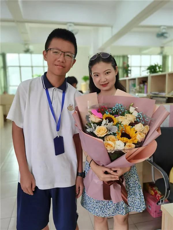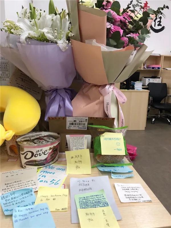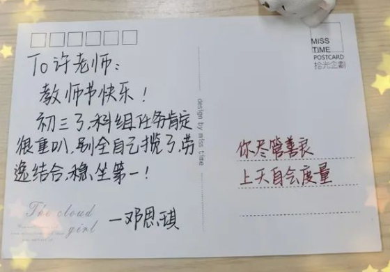 节日当天,同学们还给老师送上了鲜花和贺卡。自制的贺卡各式各样,有的画上了可爱的图案,有的用彩纸做成了花朵。样式不同,但相同的是字里行间流露的真情。“教师节快乐!初三了,科组任务肯定很重吧,别全自己揽了,劳逸结合,稳坐第一”,一位同学在贺卡中写道。