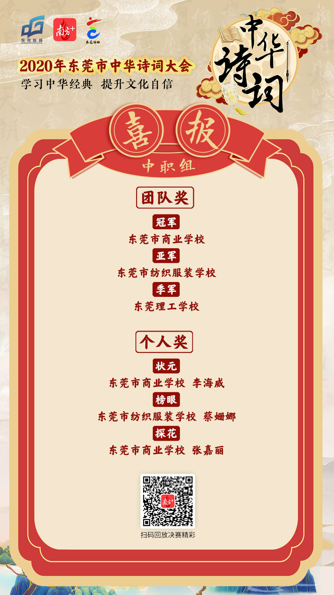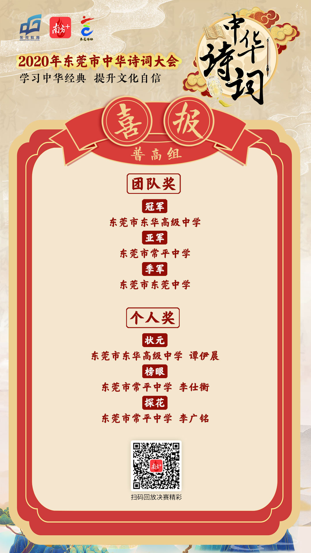 东华高中继续保持优势荣获团体冠军及个人榜状元;亚军常平中学则首次进入前三,且两位学生李仕衡、李广铭分别斩获个人榜榜眼和探花。对此校方表示,成绩的取得是学校“平正教育”品牌培育的成果之一,学校一直以来坚持素质教育及对传统文化的重视,秉承“立于常道、成于平实”,师生以求真务实、坚持到底的精神,不抛弃不放弃,夯实每一步。