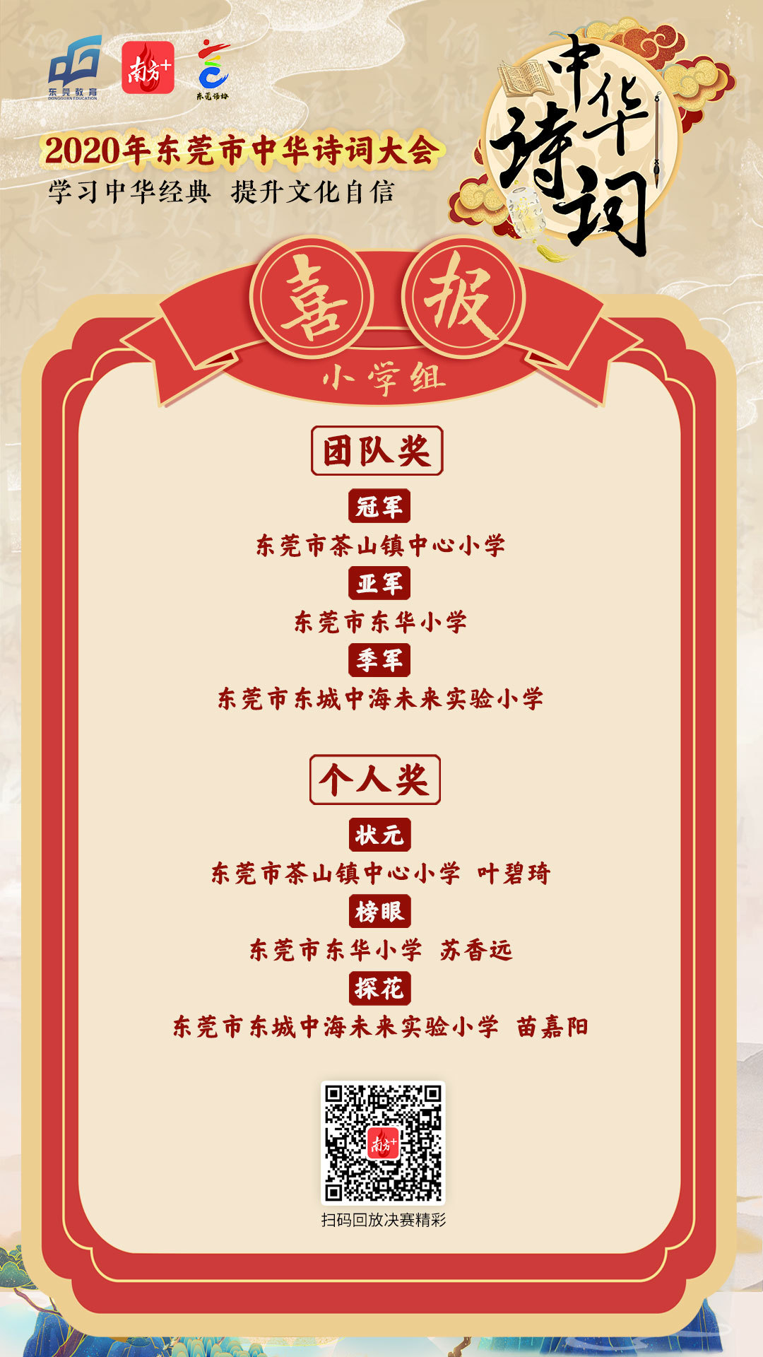 半决赛上,茶山中学以满分从松山湖片区晋级,茶山镇中心小学则以全场最高出线晋级;总决赛上两校双双捧回了冠军,并同时收获两个个人组“状元”。详见南方+报道:教育观察|连夺4项冠军,茶山怎么这么牛?