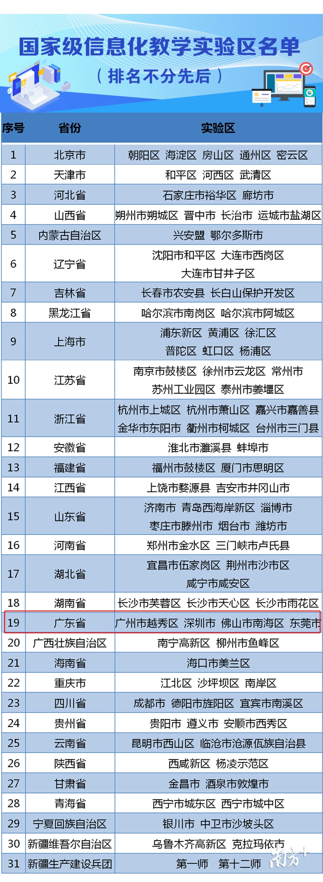 为推进教育教学改革,提高基础教育质量,加快推进基础教育现代化,去年教育部办公厅发布了《关于推荐遴选“基于教学改革、融合信息技术的新型教与学模式”实验区的通知》,经遴选推荐、专家评审,今年8月教育部确定了“基于教学改革、融合信息技术的新型教与学模式”实验区名单(以下简称“实验区”)。全国共有31个省、直辖市和自治区的90个区域被确定为实验区,其中广东省共有广州市越秀区、深圳市、佛山市南海区、东莞市4地入选。