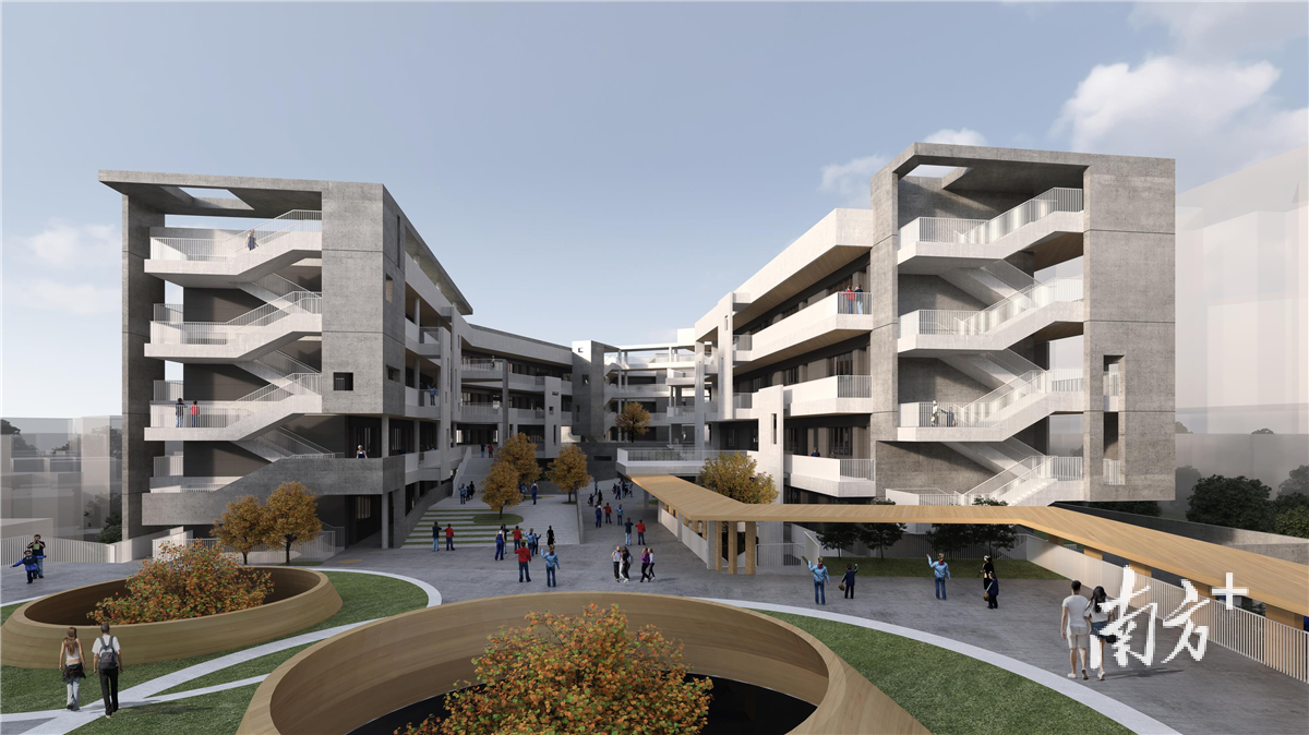 例如学校分为教学区、生活区、文体区,但南北两侧地块中间隔着一条马路,在连通方面没有采用传统的天桥模式,而是利用建筑的二层平台相连接,并且所有的教学课室均设计在二层及以上楼层,学生上课、吃饭、运动等活动都非常方便。“我们是把它作为莞城的一个景点、亮点来打造设计的。”黄灿明说。