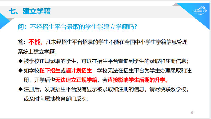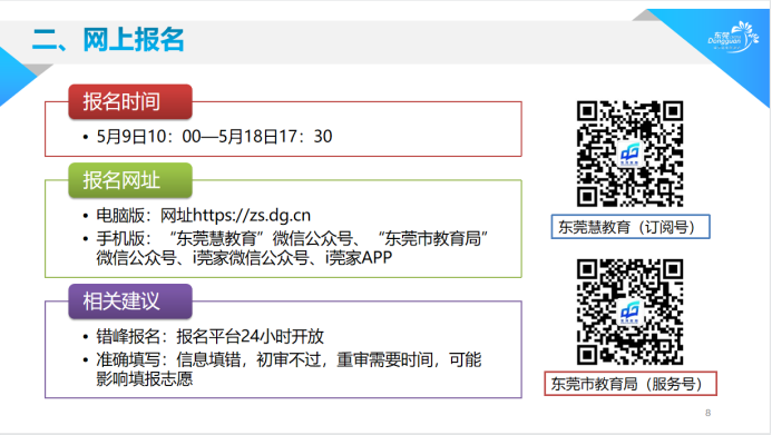 具体而言,符合招生入学条件的学生,须在5月9日10:00—5月18日17:30内通过手机上的“东莞慧教育”微信公众号,“东莞市教育局”微信公众号,i莞家微信公众号,i莞家APP或电脑(网址:https://zs.dg.cn)报名,凡未经招生平台招录的学生不能在学籍系统建立学籍。