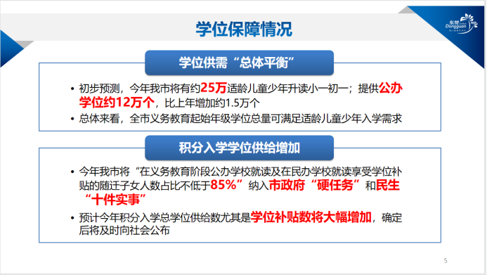 值得一提的是,今年东莞将“在义务教育阶段公办学校就读及在民办学校就读享受学位补贴的随迁子女人数占比不低于85%”纳入市政府“硬任务”和民生“十件实事”, 预计今年积分入学总学位供给数尤其是学位补贴数将大幅增加,欢迎符合条件的随迁子女家长积极申请。