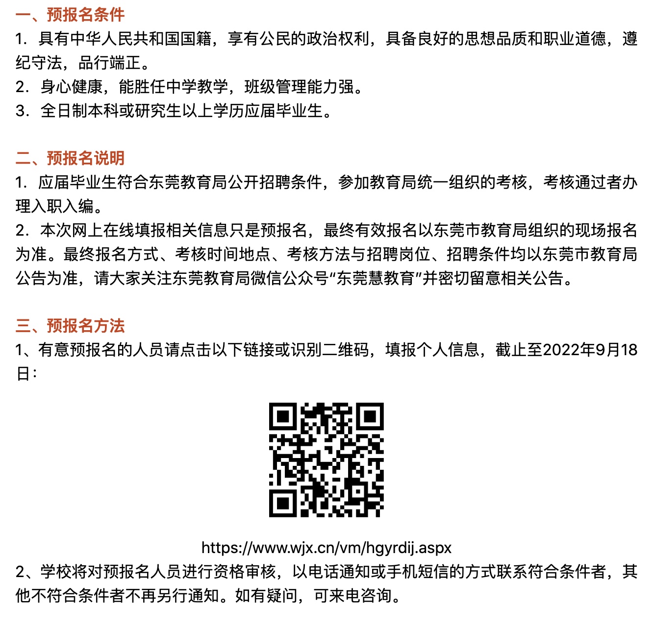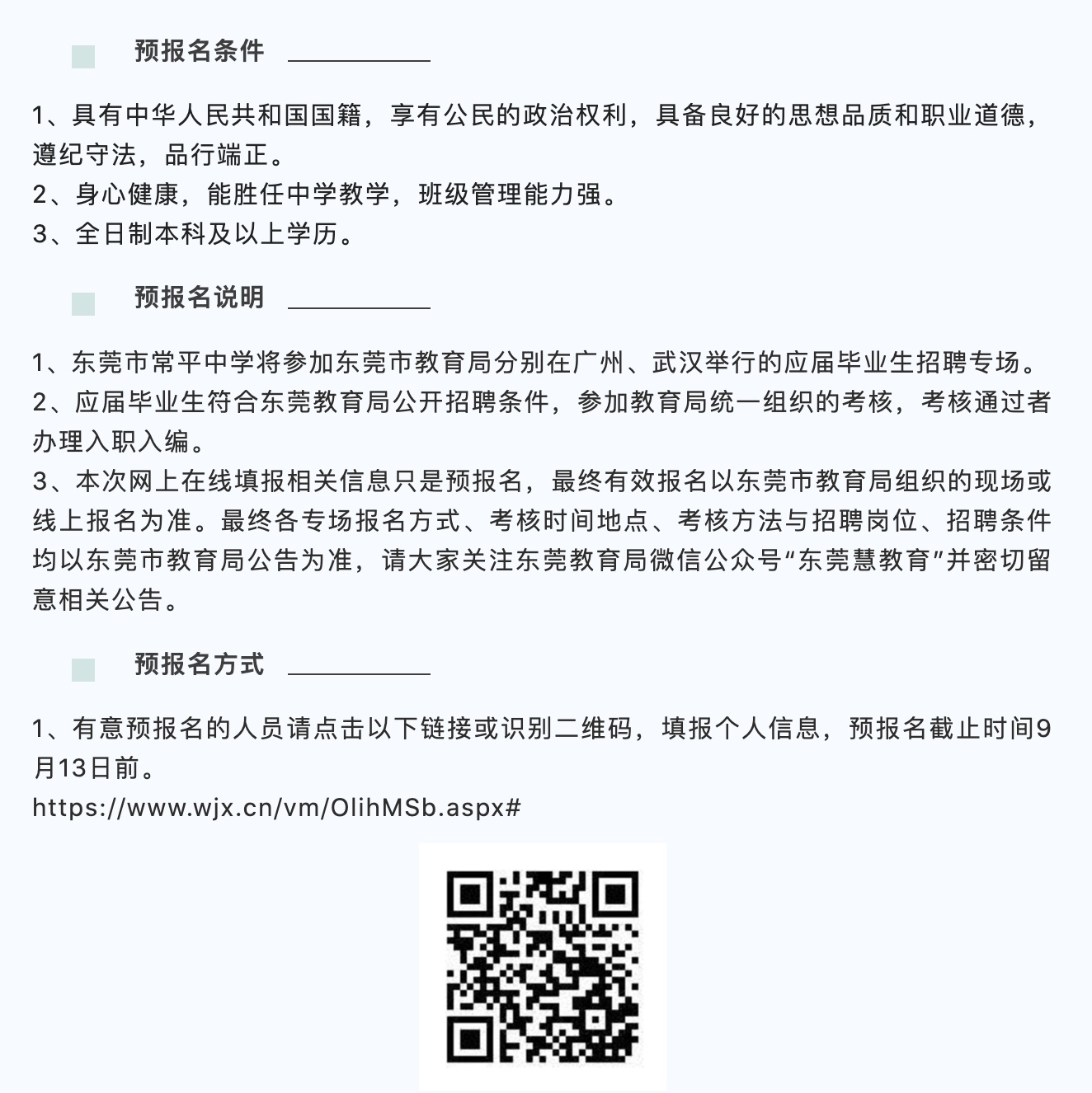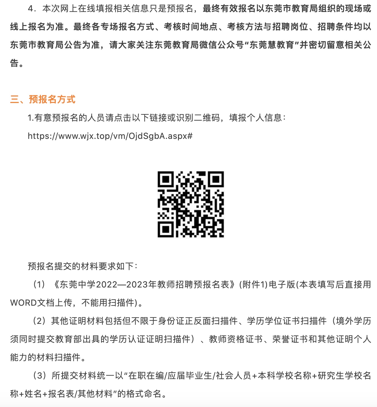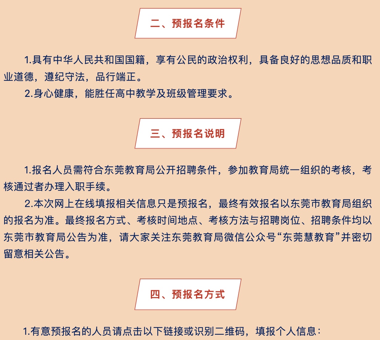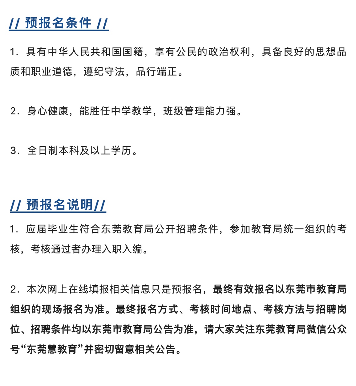 本次网上在线填报相关信息只是预报名,最终有效报名以东莞市教育局组织的现场报名为准。最终报名方式、考核时间地点、考核方法与招聘岗位、招聘条件均以东莞市教育局公告为准,请大家关注东莞教育局微信公众号“东莞慧教育”并密切留意相关公告。