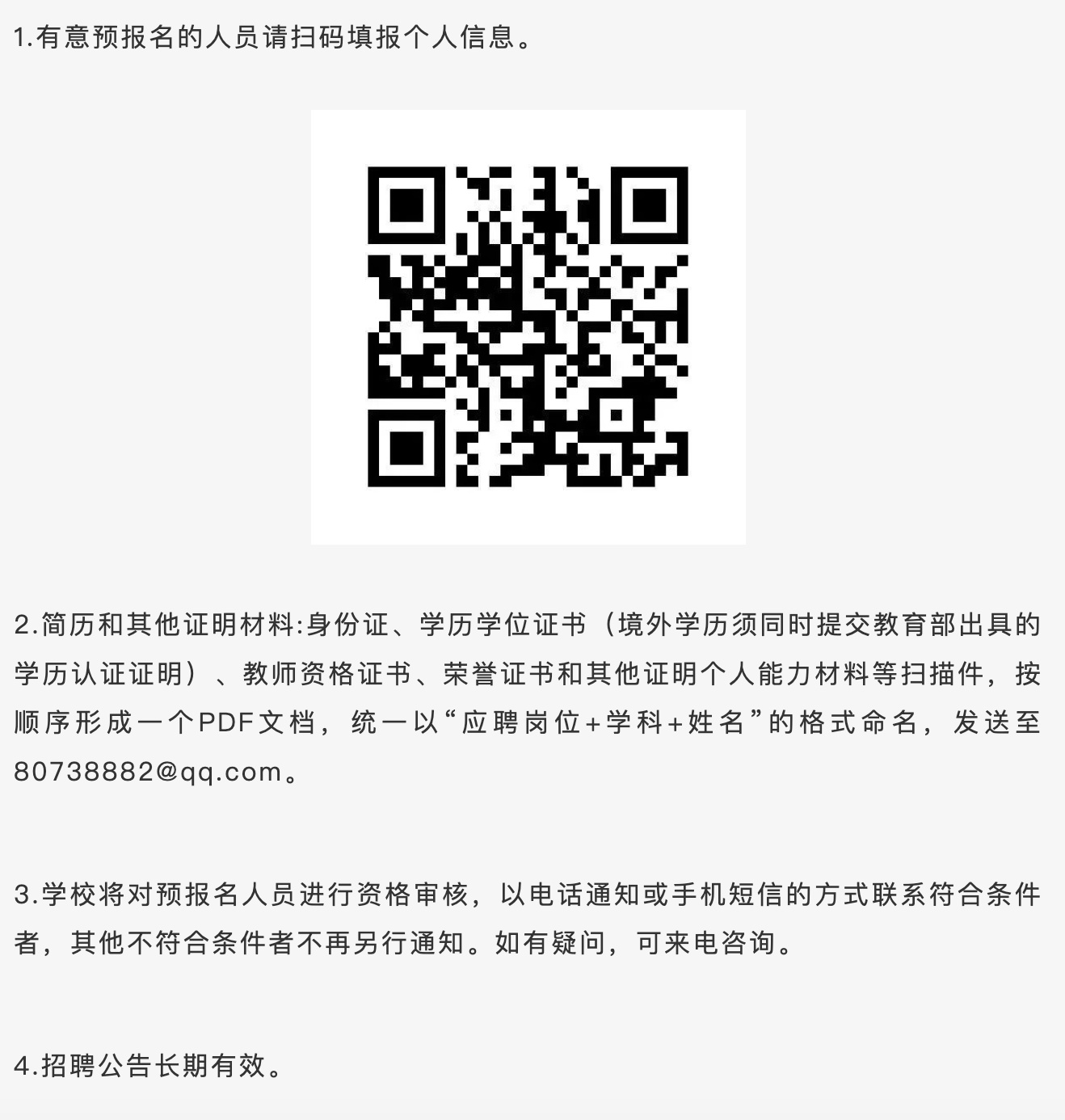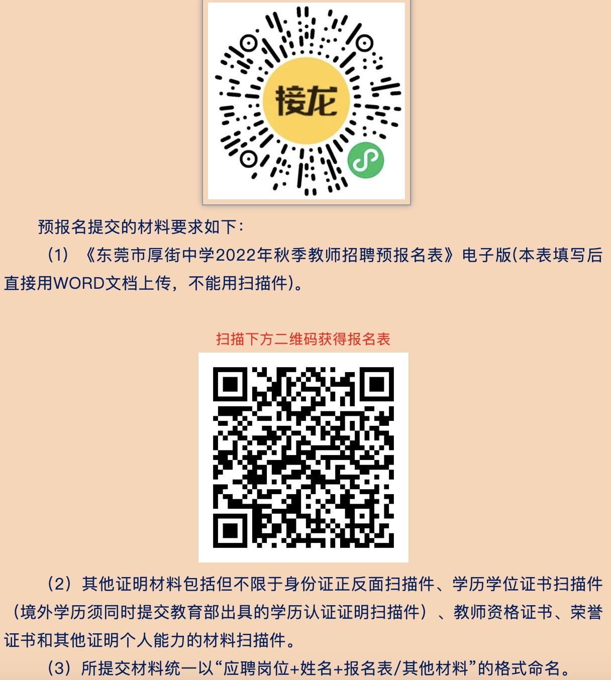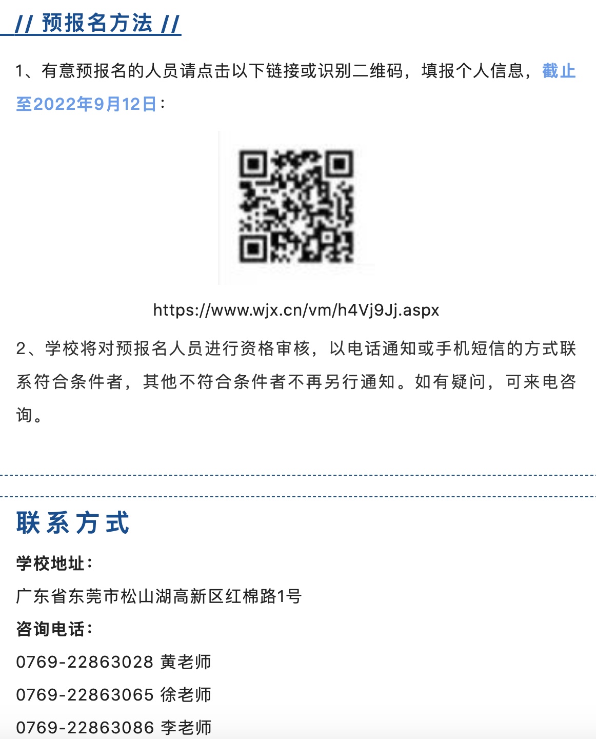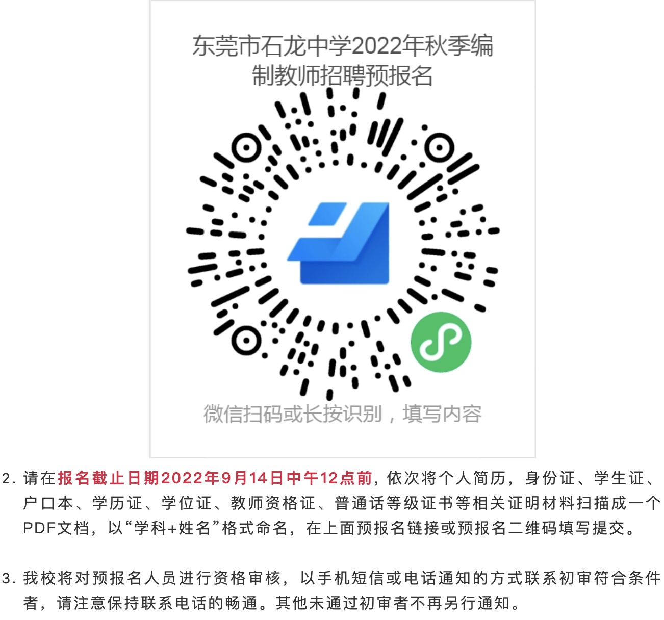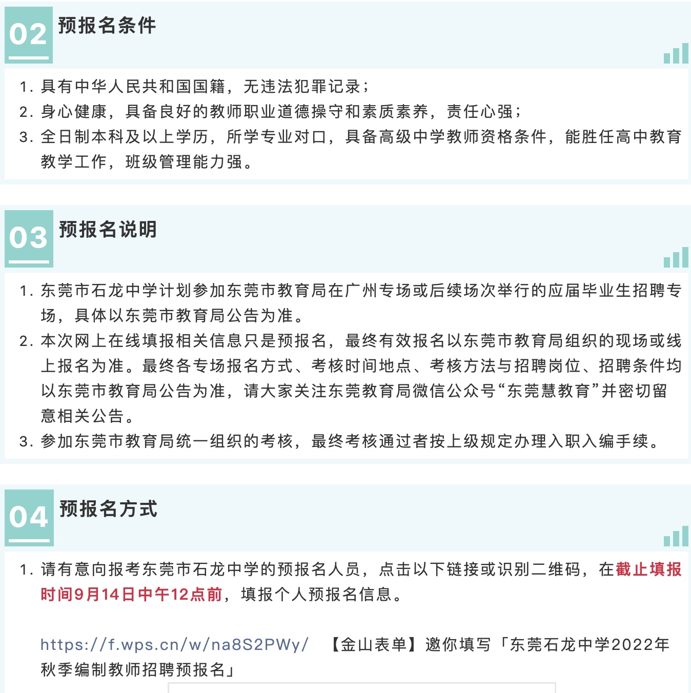 本次网上在线填报相关信息只是预报名,最终有效报名以东莞市教育局组织的现场报名为准。最终报名方式、考核时间地点、考核方法与招聘岗位、招聘条件均以东莞市教育局公告为准,请大家关注东莞教育局微信公众号“东莞慧教育”并密切留意相关公告。