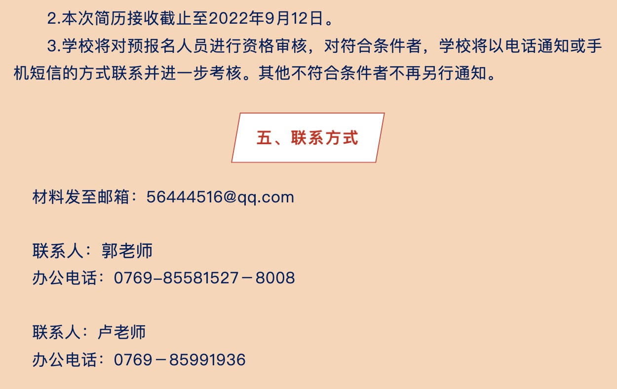 因学校发展需要,东莞市厚街中学于2022年秋季拟向全国招聘优秀应届毕业生若干人,入职时间从2023年7月开始。