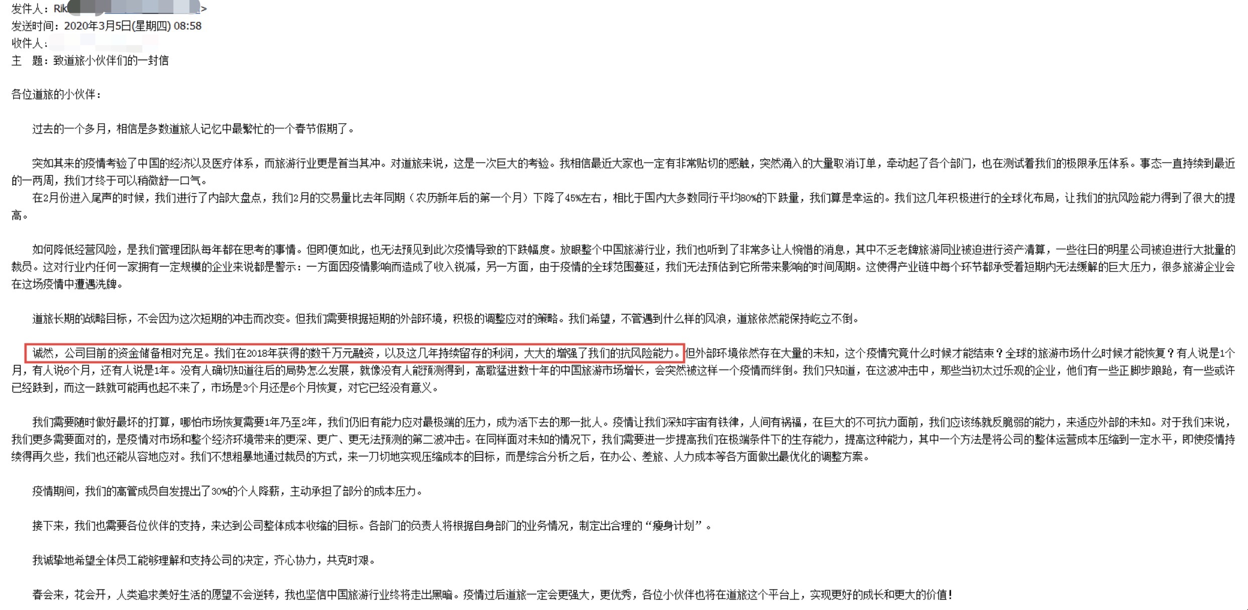这对孙先生而言,是难以置信的。他出示了一封公司3月5日群发的邮件:公司目前的资金储备相对充足,我们在2018年获得的数千万元融资,以及这几年持续留存的利润,大大增强了我们的抗风险能力。
