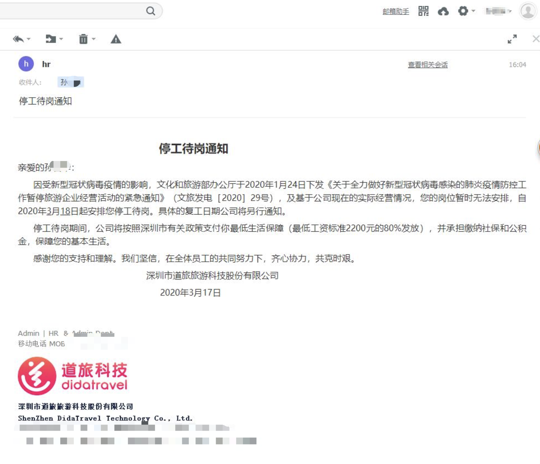 孙先生晒出的停工待岗通知邮件