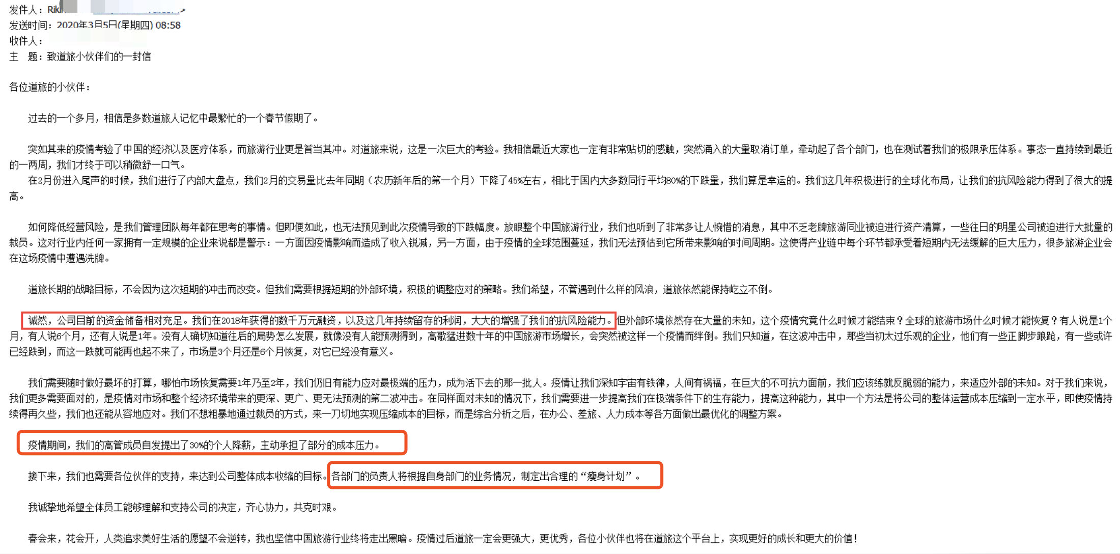 在孙先生出示的邮件中,小南注意到有写明“疫情期间,高管成员自发提出30%的个人降薪,主动承担了部分成本的压力。”“各部门的负责人将根据自身部门的业务情况,制定出合理的‘瘦身计划’”。