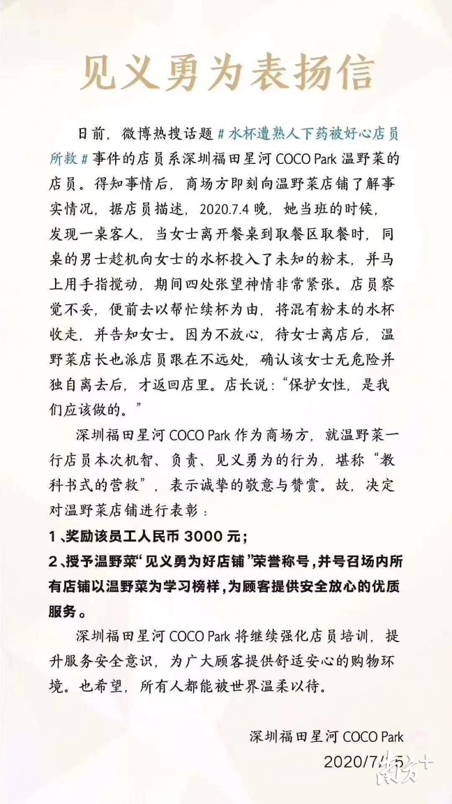 近日,深圳女顾客疑遭男伴“下药”被餐厅店员及时发现并提醒。目前嫌疑男子因涉嫌强奸,已被警方刑拘。7月15日,深圳福田星河cocopark商场对见义勇为的店员及店家发信表扬。