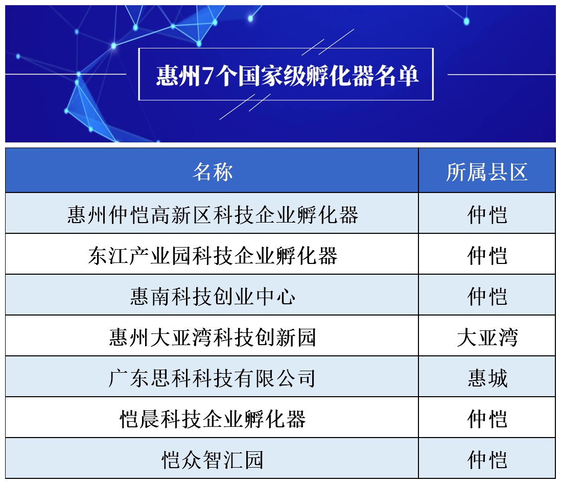 如果这两家孵化器都通过公示,惠州市的国家级孵化器将达到7家。此外,位于仲恺的科环孵化器和博罗的名巢科技创意产业园,都是国家级孵化器培育单位。