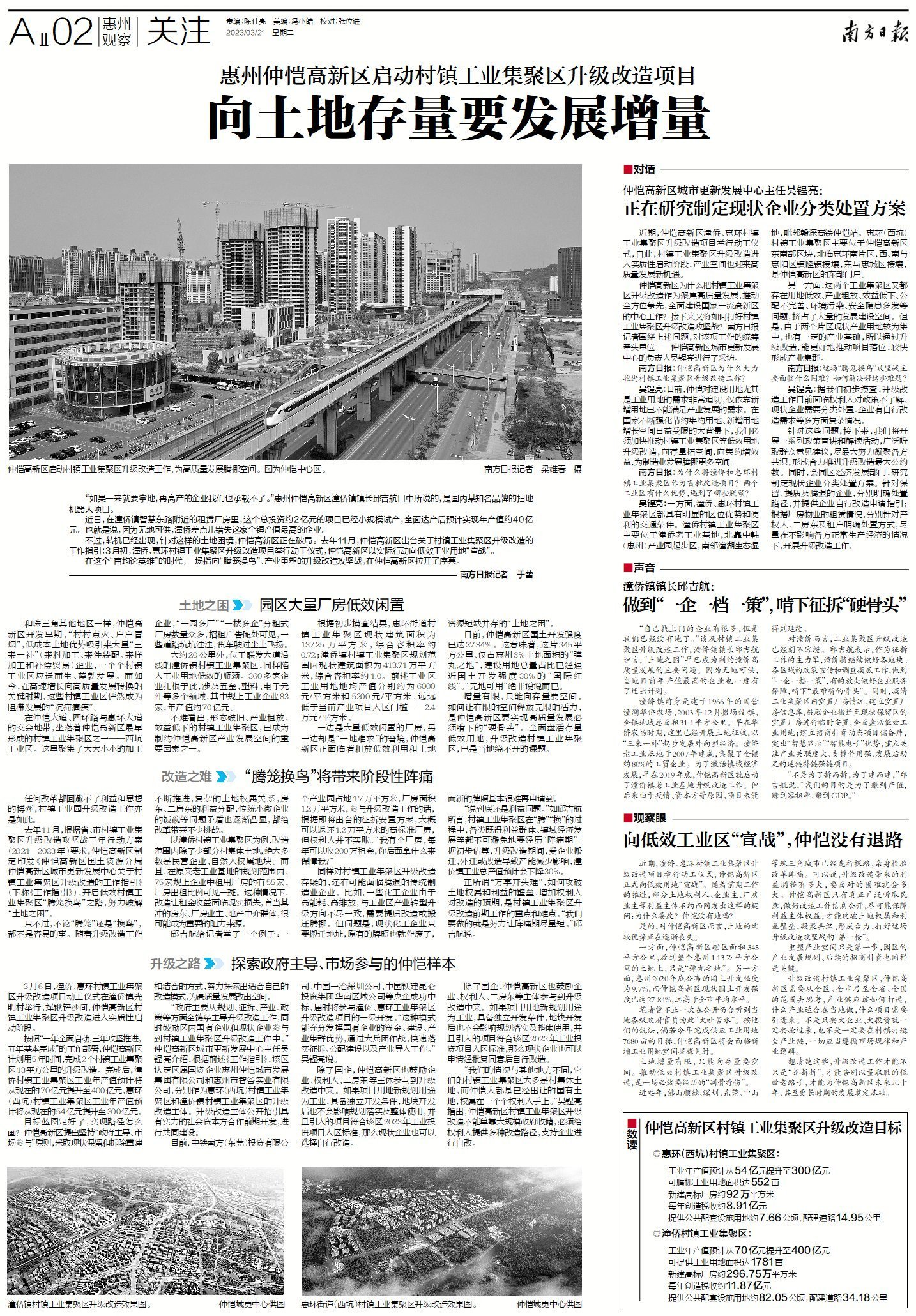 不过,转机已经出现,针对这样的土地困境,仲恺高新区正在破局。去年11月,仲恺高新区出台关于村镇工业集聚区升级改造的工作指引;3月初,潼侨、惠环村镇工业集聚区升级改造项目举行动工仪式,仲恺高新区以实际行动向低效工业用地“宣战”。