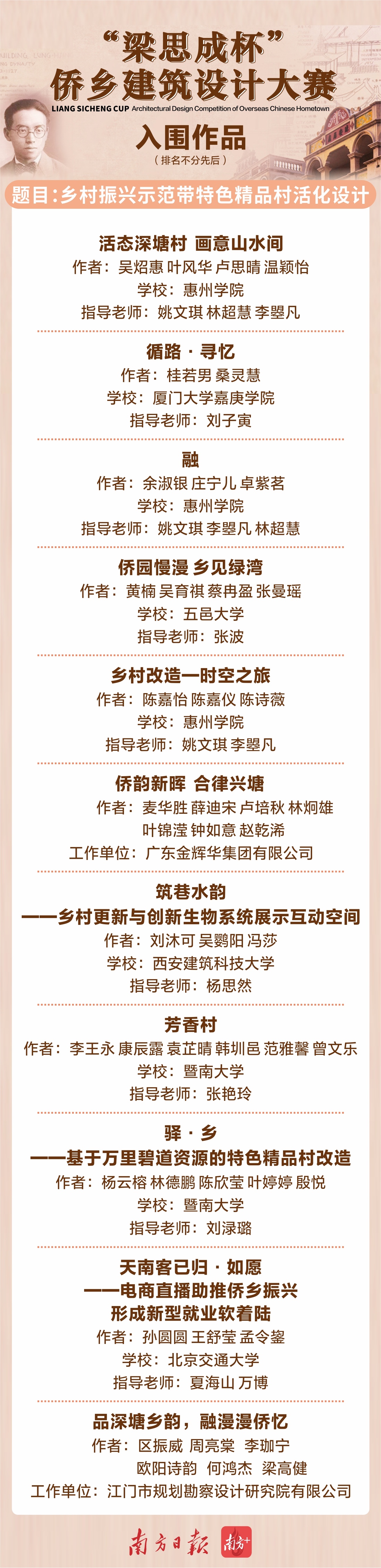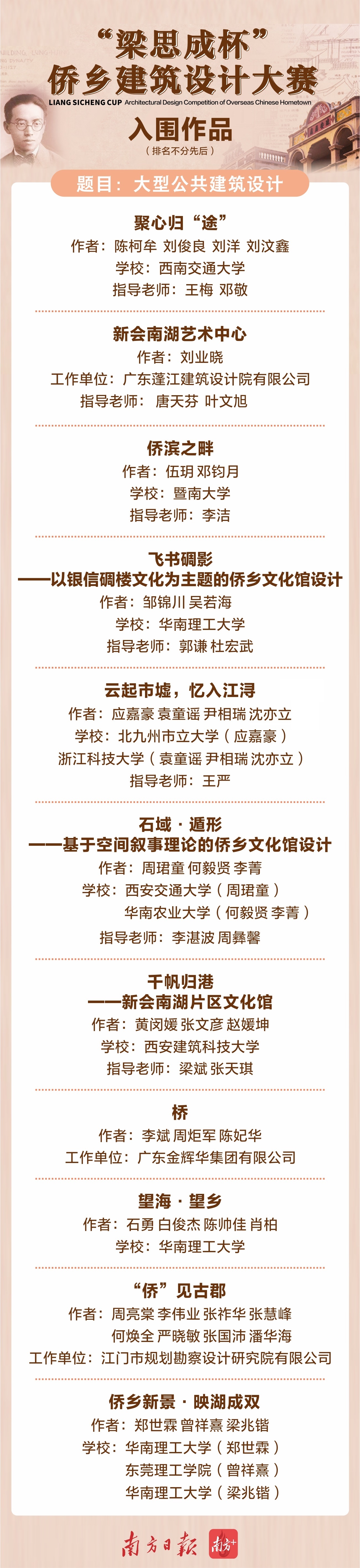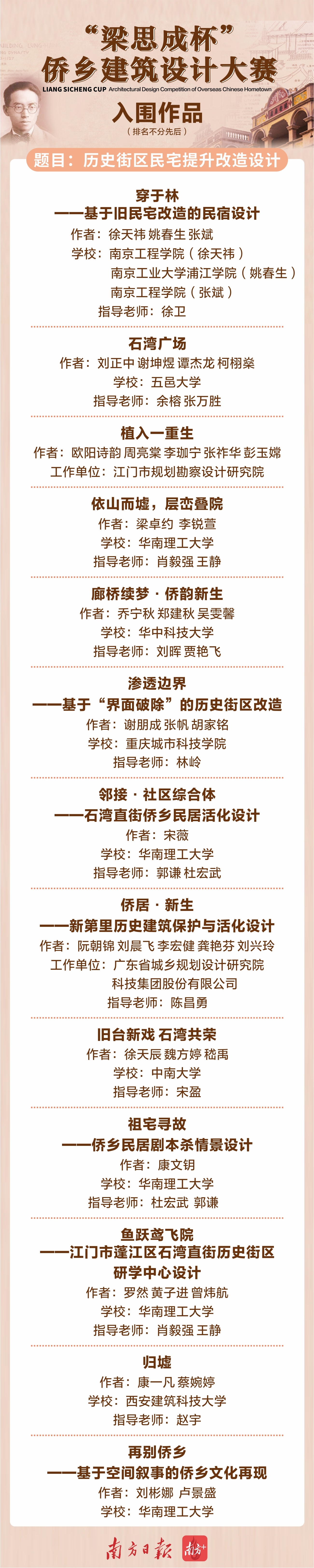 据了解,大赛启动以来受到全国各地高校师生和设计机构关注,累计收到700多人登记报名并领取了资料,最终收到超过150件参赛作品。目前,大赛评审团已确定入围作品51件(名单详见文末)。本次大赛的一、二、三等奖以及优秀奖均在入围作品中产生。另外,所有入围作品都将于12月11日12:00至17日24:00进入网络投票环节(网络投票结果不影响专家评审),每个赛题得票最高的前三名可获评“最佳人气奖”。(点击进入“梁思成杯”侨乡建筑设计大赛作品网络投票)