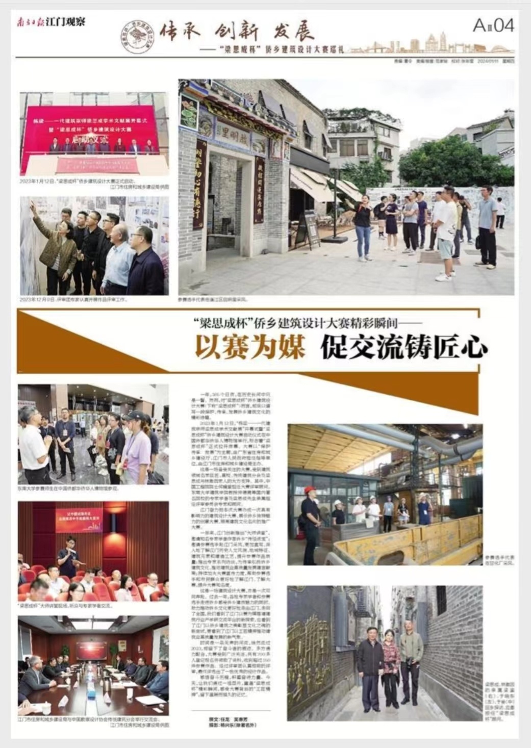 一年来,江门创新推出“大师讲堂”,邀请知名专家学者作客侨乡“传经送宝”;邀请参赛选手赴江门采风,更加直观、深入地了解江门历史人文风貌、地域特征、建筑元素和建造工艺,提升参赛作品质量;推出专家系列访谈,为传承弘扬侨乡建筑文化、推动建筑业高质量发展建言献策;持续加大大赛宣传力度,帮助参赛选手和市民群众更好地了解江门、了解大赛,提升大赛知名度。