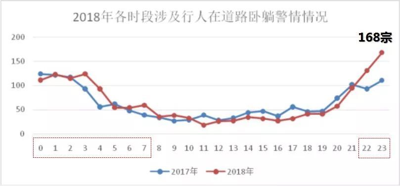 据@深圳交警,2018年接报涉及行人卧躺在道路警情中,最高峰值在夜间23时,共接报警情168宗,高发时段在22时至次日7时,共接报警情1032宗。