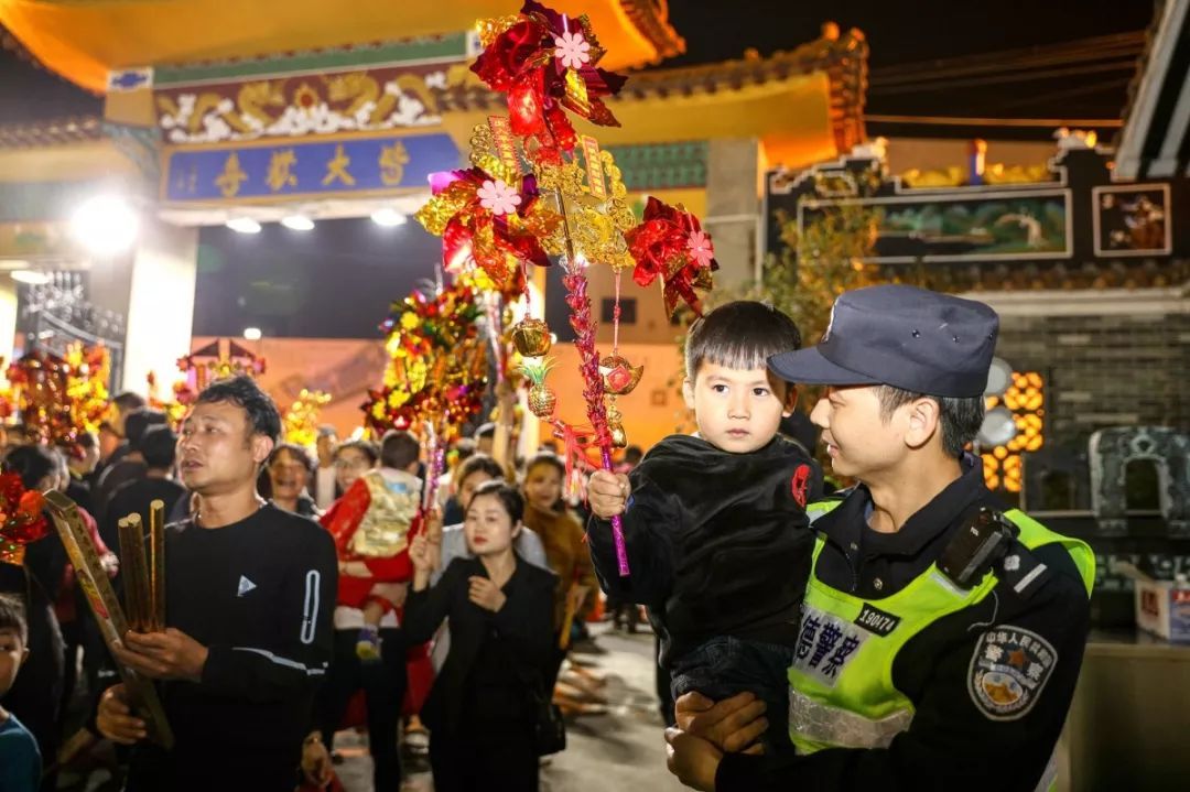 高举风车,经过观音神像投掷硬币许愿,向捐款箱中投入一份善心……3月1~2日两天,佛山顺德容桂一年一度的传统民俗“观音开库”如期而至,吸引了成千上万的本市以及周边城市的市民前来祈福。“观音开库”热闹非凡,香火鼎盛,就在这流光溢彩之中,佛山市顺德区公安局容桂派出所的民警穿梭在人群里,默默守护着这一份喜庆。