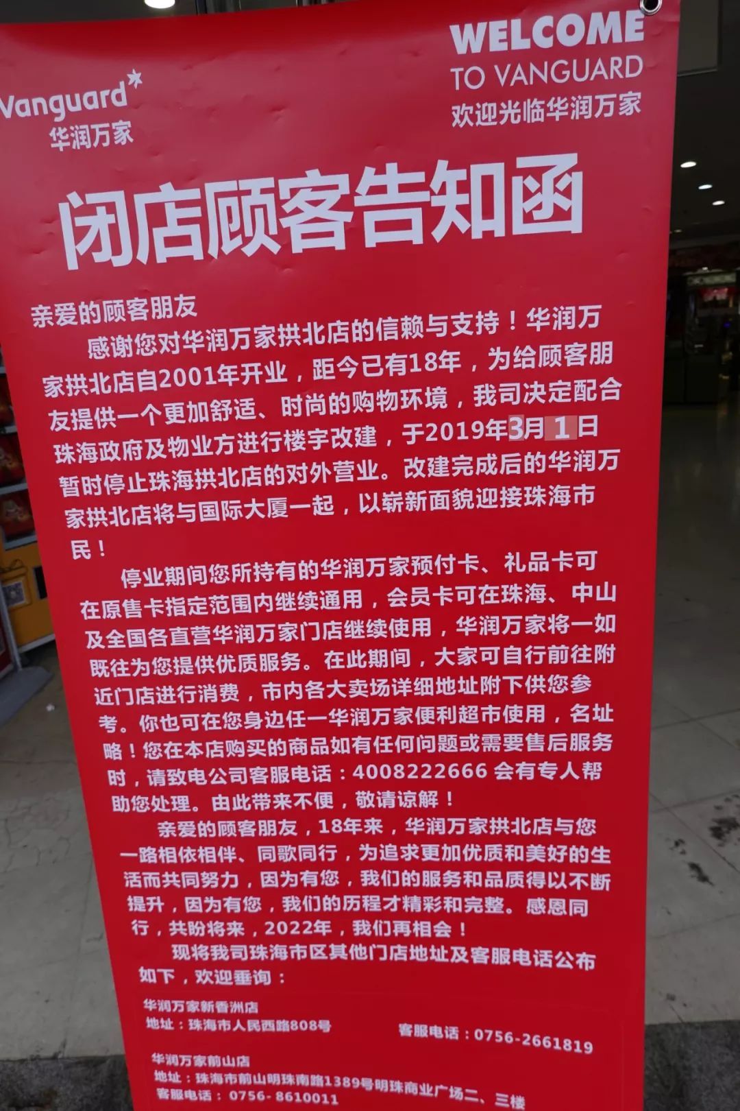 拱北华润万家将于今年3月起歇业三年
