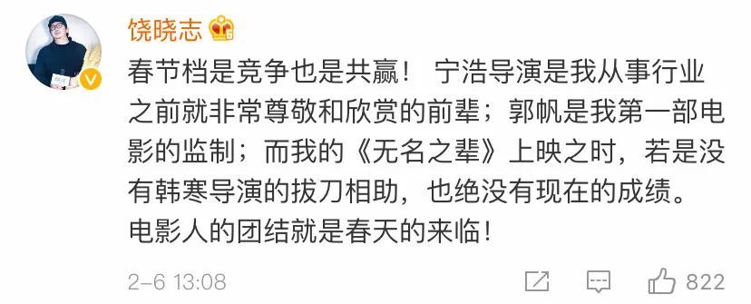 《无名之辈》的导演饶晓志在微博下面评论