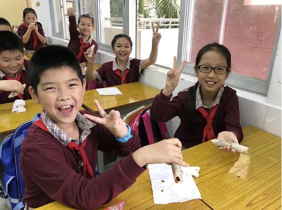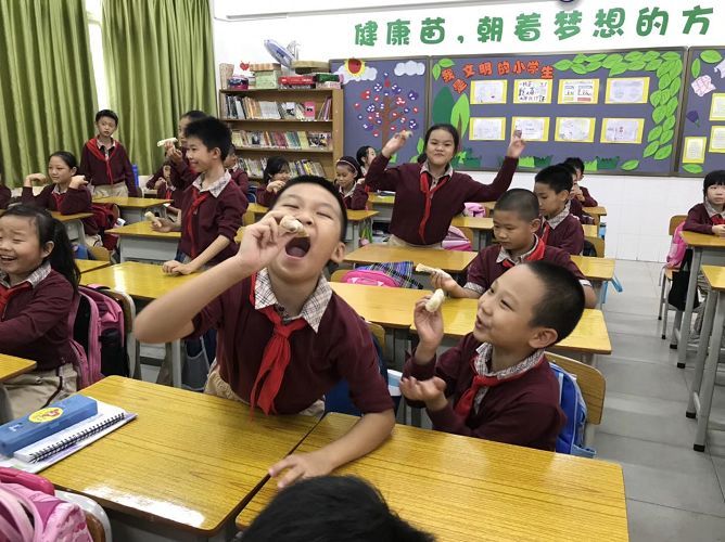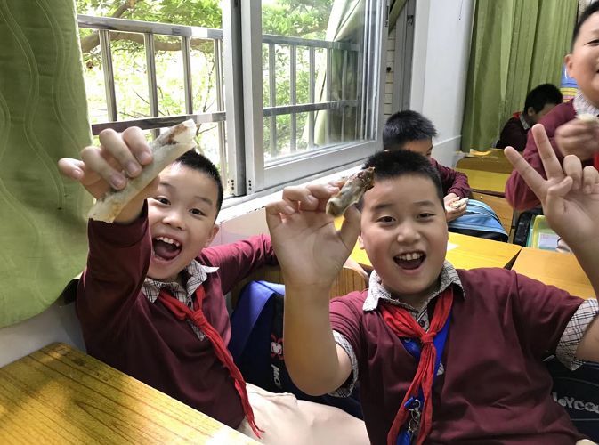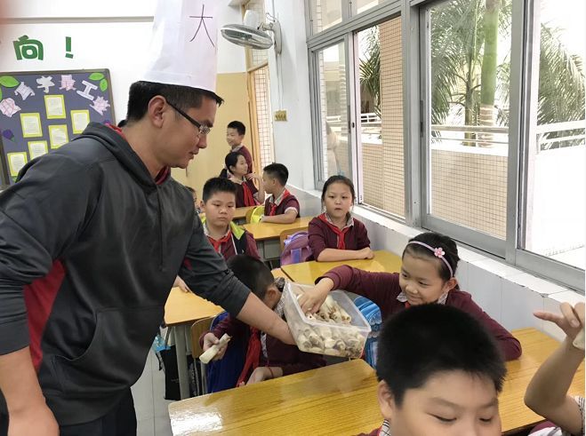 这可是一只有故事的烤鸭,梁老师制作了一顶写着“大厨”的帽子,为同学们片烤鸭。让南方的孩子们对这种来自北方的美食念念不忘~