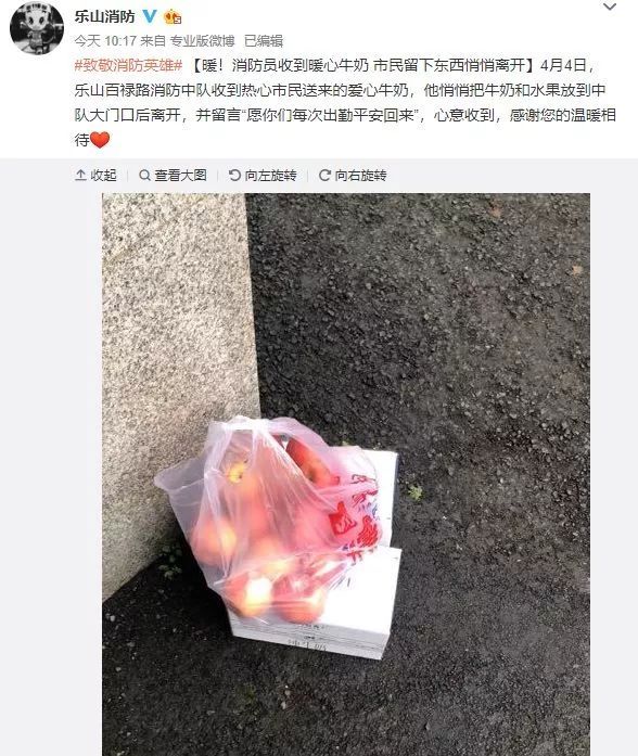 @乐山消防:4月4日,乐山百禄路消防中队收到热心市民送来的爱心牛奶,他悄悄把牛奶和水果放到中队大门口后离开,并留言“愿你们每次出勤平安回来”,心意收到,感谢您的温暖相待