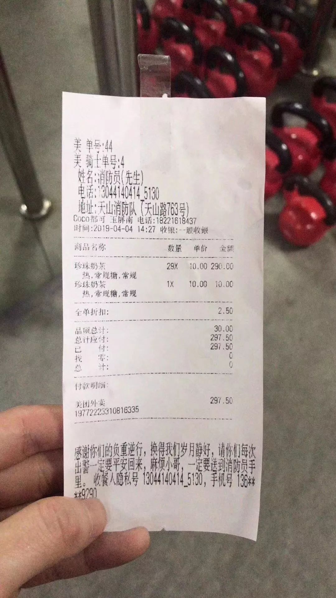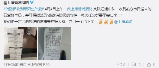 4月3日15时30分,一名外卖小哥突然拎着三箱牛奶、两袋水果走进了济南消防支队天桥区大队,称这些东西是有人特意下单让他送来。而外卖单上还写下了暖心留言:“希望你们一身本领,永无用武之地!”