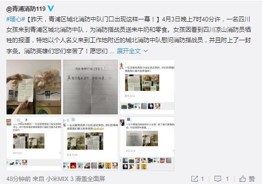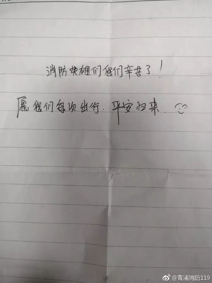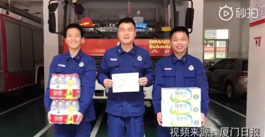 4月3日早,一个学生模样的男孩来到厦门浮屿消防中队门口,分两趟扛来了两箱水,三箱牛奶,还留下一封信:“哥哥们,愿你们所有危险来临时都能躲过,我不希望你们满身荣誉,只愿你们平安归来!”