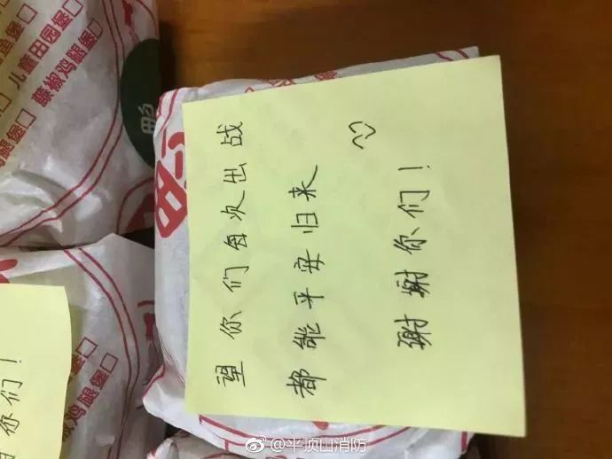 @平顶山消防:午饭时间,意外收到一份外卖。纸条上的留言带来一阵阵暖意!