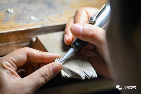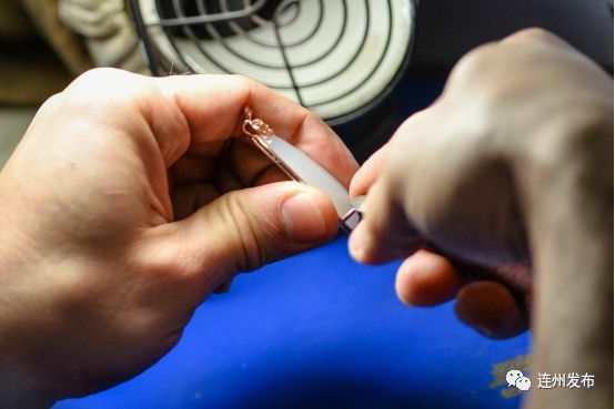 砑光工艺则全部以手工进行,首饰工匠用特制的砑刀在首饰表面来回推动。由于这项工艺需要熟练的技术和手法,许多来自连州的珠宝工匠经过长年累月的磨炼,都成为了镶嵌工序的行家里手,也树立了连州“珠宝佬”的良好口碑。