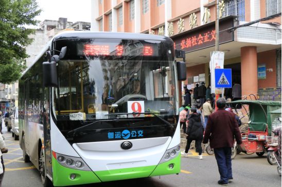连州市区运行的新能源纯电动公交车很好识别,车身有明亮的绿色标识,区别于传统的蓝色车身标识。