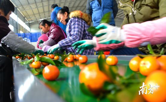 利用柑桔分拣打蜡设备,沙糖桔的分拣工包括倒入、冲洗、泡水、消毒、提升、烘干、打蜡、烘干、分拣、人工分拣、包装等11个工序,不仅大大提高了分拣效率,也间接提升了沙糖桔的批发价,促进种植户增收。