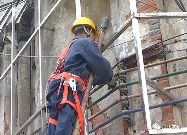 现场工作人员使用工具小心翼翼将砖块拆除