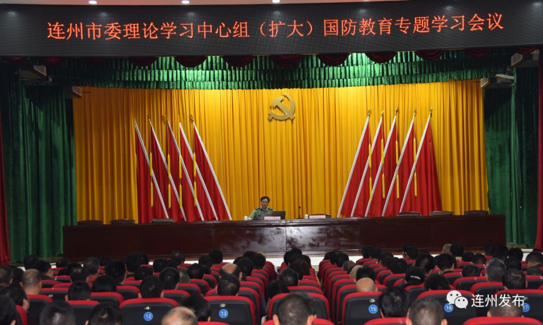 连州市委副书记陈世文主持学习会。市四套班子在家领导、市直科级以上领导干部、市人武部全体干部约500人参加专题学习会。