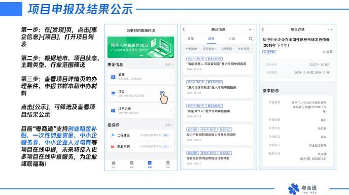 据介绍,作为企业专属移动应用平台,“粤商通”将各层级政府部门涉企服务集成到APP上,一次登录即可享受企业开办、招投标、信用查询、创业补贴申请、融资贷款、工程建设审批等超过300项服务,真正实现企业办事“一站式”“免证办”“营商通”。